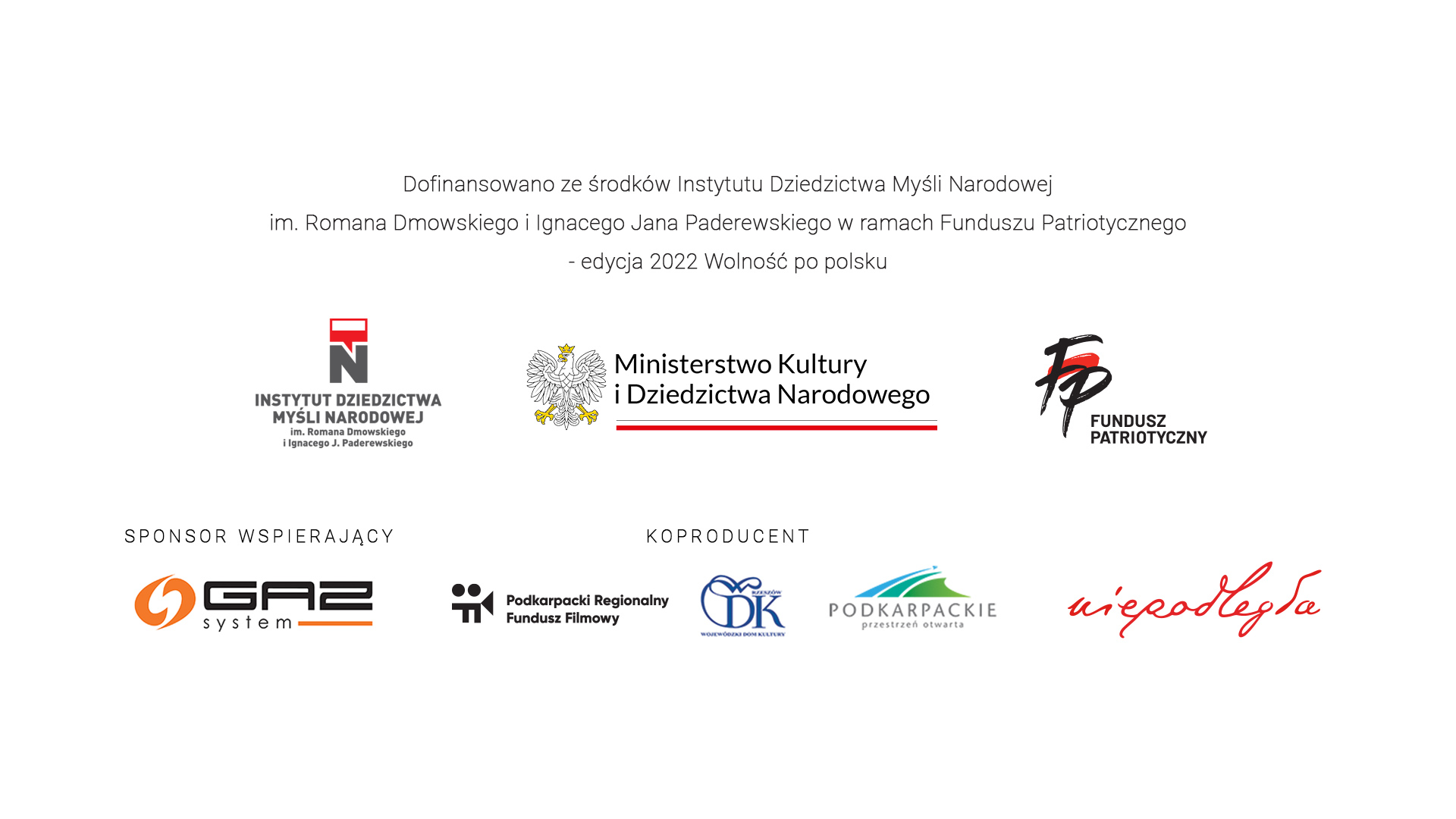 Film uzyskał dofinansowanie ze środków Instytutu Dziedzictwa Myśli Narodowej im. Romana Dmowskiego i Ignacego Jana Paderewskiego w ramach Funduszu Patriotycznego. Koproducentem filmu jest Podkarpacka Komisja Filmowa. Film uzyskał również wsparcie finansowe Województwa Podkarpackiego w ramach Podkarpackiego Regionalnego Funduszu Filmowego jako koproducent filmu. Sponsorem wspierającym jest GAZ-SYSTEM. Produkcję wsparły również lokalne firmy i podkarpackie samorządy.