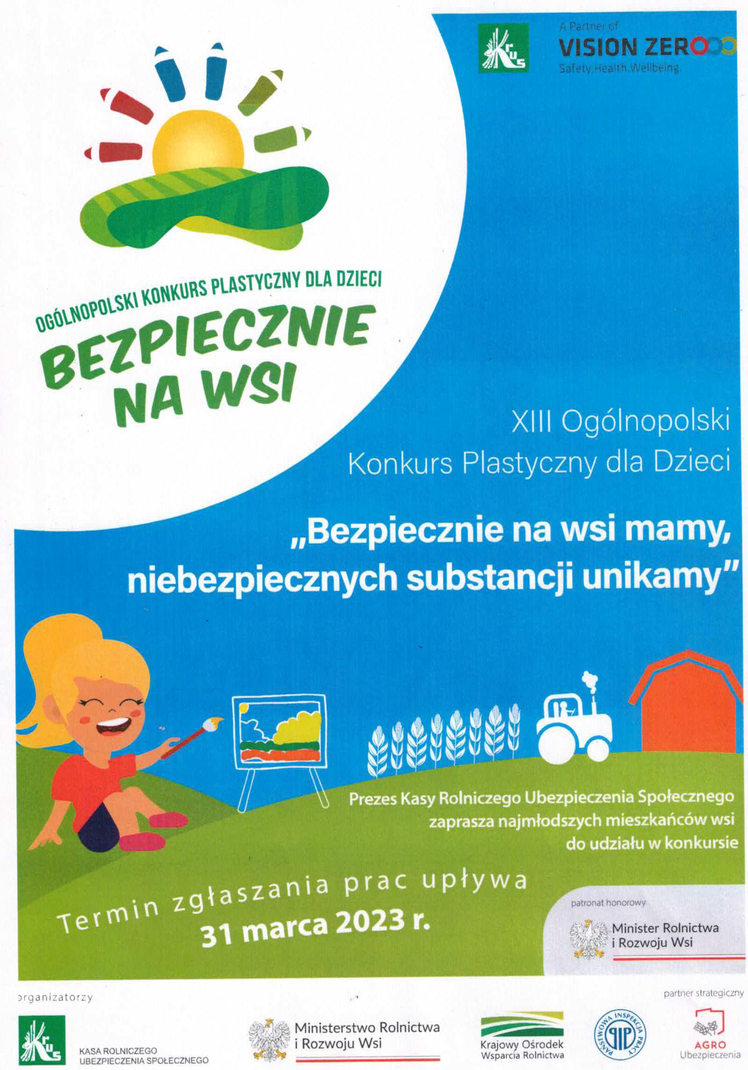 Kasa Rolniczego Ubezpieczenia Społecznego serdecznie zaprasza dzieci z terenów wiejskich do udziału w XIII Ogólnopolskim Konkursie Plastycznym dla Dzieci „Bezpiecznie na wsi mamy, niebezpiecznych substancji unikamy”.