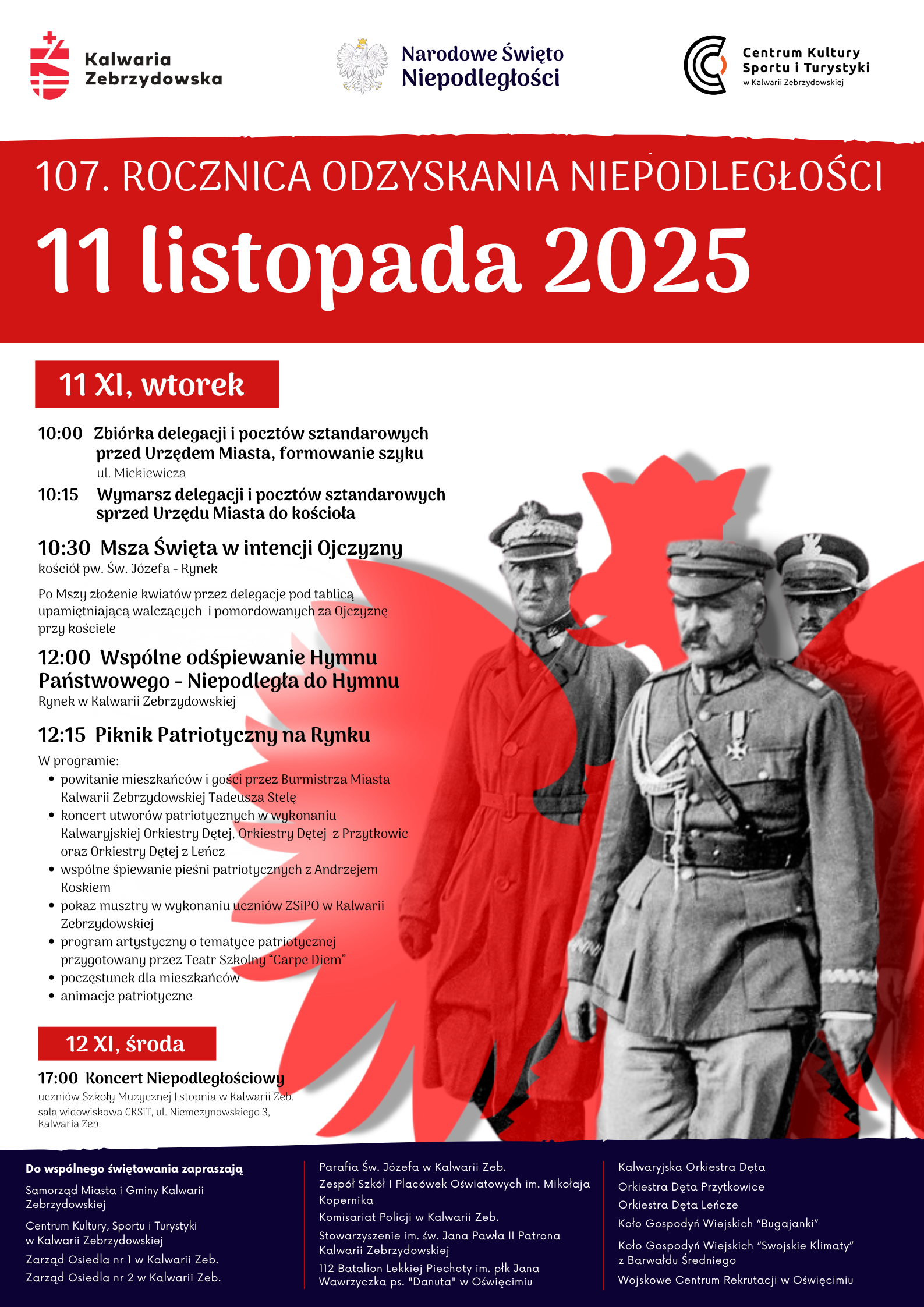 We wtorek, 11 listopada 2025 r., mieszkańcy Gminy Kalwaria Zebrzydowska wspólnie uczczą 107. rocznicę odzyskania przez Polskę niepodległości.