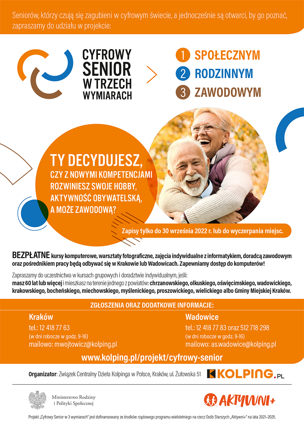 Wadowicki Kolping zaprasza osoby po 60 roku życia do współpracy w ramach projektu "Cyfrowy Senior w trzech wymiarach". Projekt przeznaczony jest dla osób, które swój wolny czas chcą poświęcić na doskonalenie własnych umiejętności w obsłudze komputera/tabletu/smartfona oraz uczestnictwa w takich wydarzeniach jak kurs fotografii wraz z wernisażem, stworzenie multimedialnej prezentacji, krótkometrażowego filmu czy kampanii reklamowej oraz uczestnictwo w seminariach online ze specjalistami.