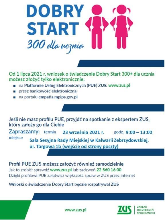 Zakład Ubezpieczeń Społecznych zaprasza na spotkanie z ekspertem ZUS. Spotkanie, na którym przedstawiciel ZUS złoży za Ciebie wniosek o świadczenie Dobry Start 300+ dla ucznia odbędzie się 23 września 2021 r. (czwartek) w godz. 9:00 – 13:00 w Sali Sesyjnej Rady Miejskiej. Kalwaria Zebrzydowska, ul. Targowa 1b – (wejście od strony Poczty Polskiej).