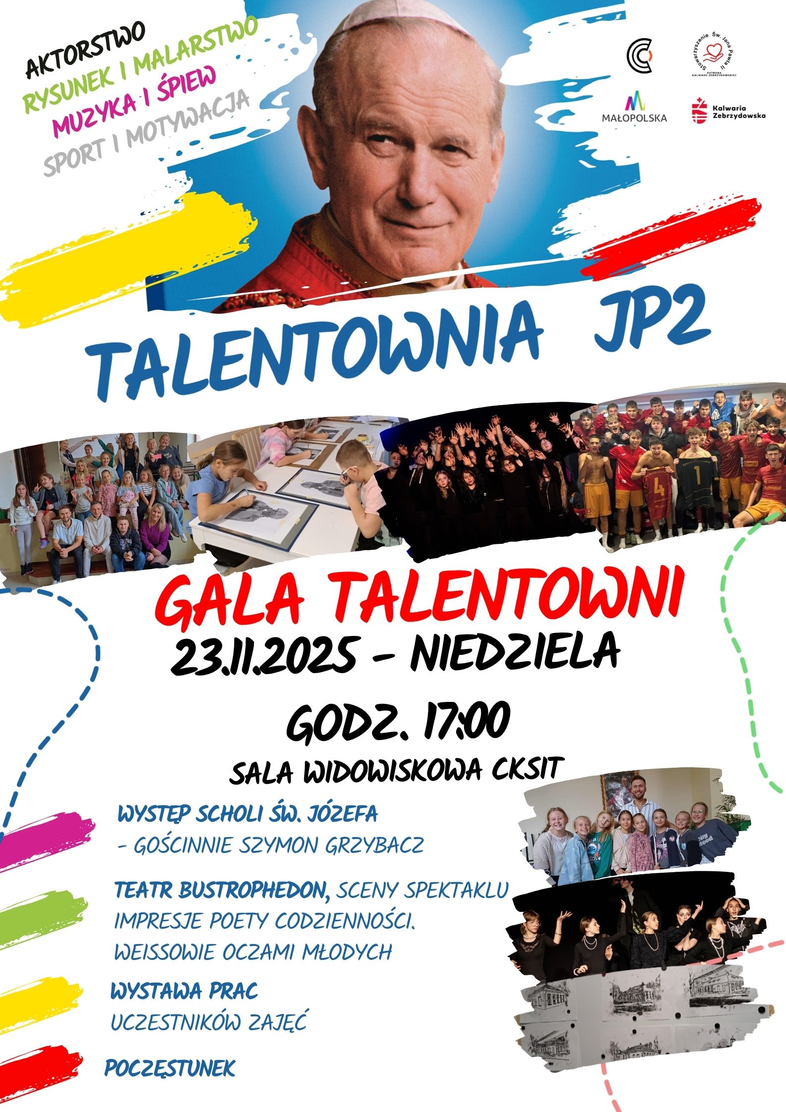 Stowarzyszenie im. św. Jana Pawła II Patrona Kalwarii Zebrzydowskiej zaprasza na Galę Talentowni Jana Pawła II, która odbędzie się w najbliższą niedzielę, 23 listopada o godz.17:00, w Sali Widowiskowej CKSiT w Kalwarii Zebrzydowskiej. Będzie to radosne podsumowanie nowatorskiego projektu edukacyjno-artystycznego „Talentownia JP2”, w ramach którego dzieci i młodzież przez ostatnie tygodnie rozwijały swoje pasje i umiejętności.