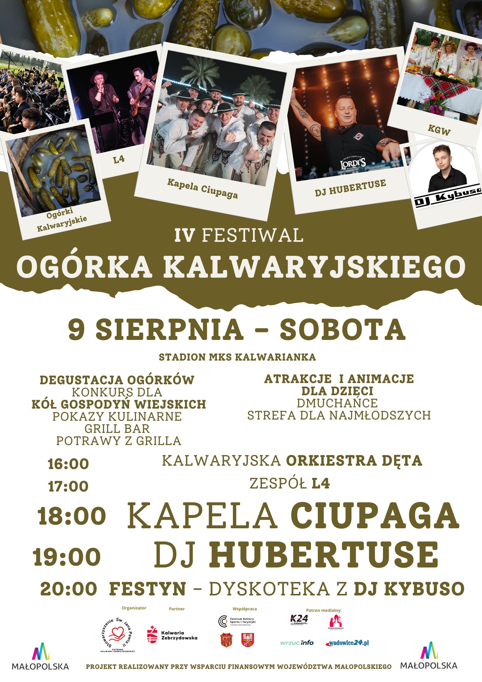 Nie zabraknie dużej sceny muzycznej i mocnego programu artystycznego, różnorodnego pod względem gatunków muzyki. Wystąpi znana i żywiołowa kapela góralska Ciupaga, której koncert porwie publiczność. Muzyczne akcenty dopełni występ Kalwaryjskiej Orkiestry Dętej, która wniesie podniosły i lokalny klimat, będzie też rockowy zespół L4, który zapewni solidną dawkę gitarowych brzmień. Dla młodzieży i wszystkich fanów nowoczesnych rytmów przygotowano muzyczną niespodziankę – na scenie pojawi się DJ Hubertuse. Całość wydarzenia wypełni wieczorny festyn poprowadzi go pełen energii DJ Kybuso, który zadba o doskonałą atmosferę.