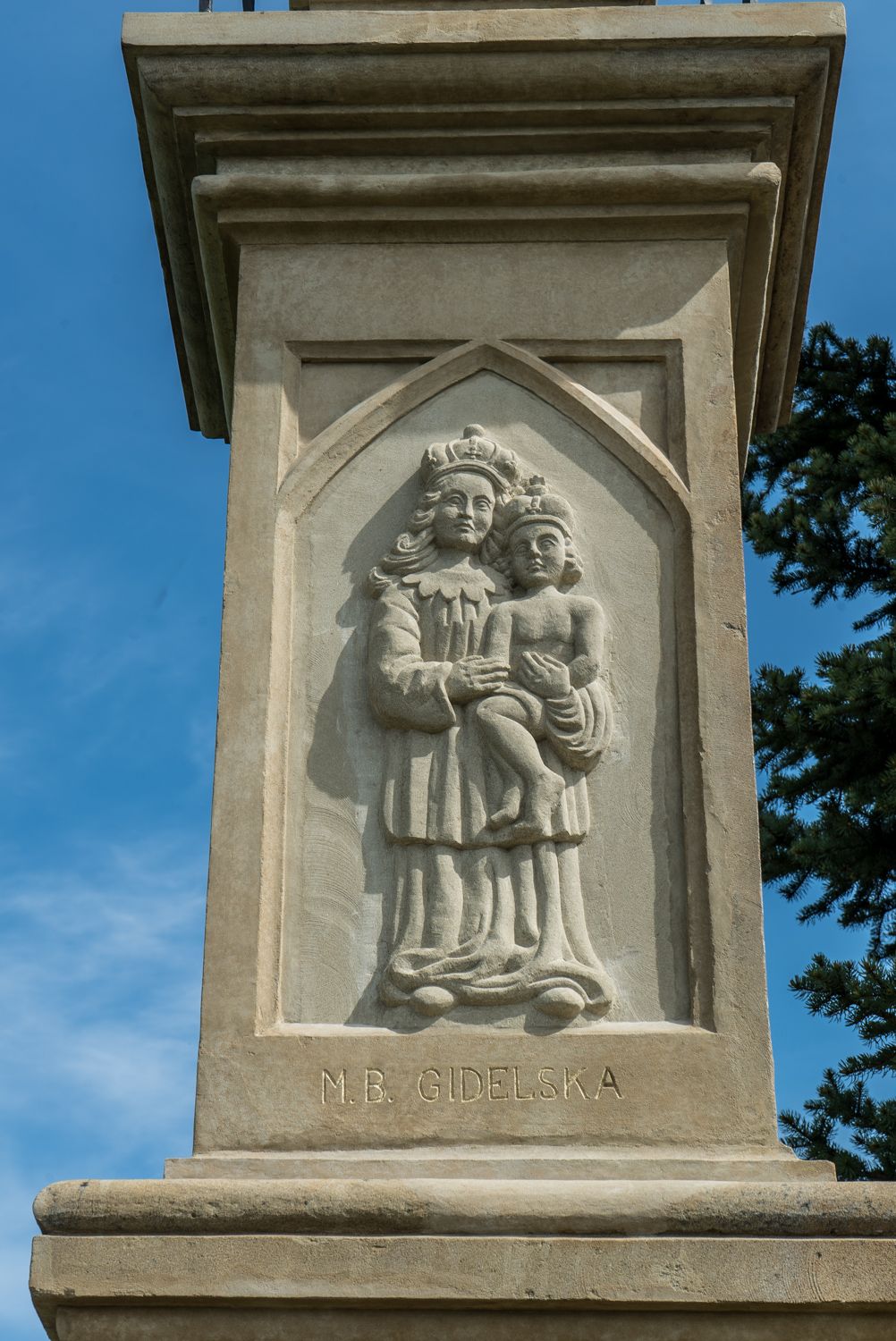 Na ścianach kolumny kapliczki znajdują się wizerunki: MB Giedelskiej, Michała Archanioła, św. Jana, Cudu w Gidlach i św. Agaty. Na froncie znajduje się napis: „Na Cześć i Chwałę Bogu w Trójcy Świętej Jedynemu i Najświętszej Maryi Panny Fundatorzy proszą o troje pozdrowienie za dusze zmarłych”. Koszt konserwacji kapliczki wyniósł 29.889 zł.