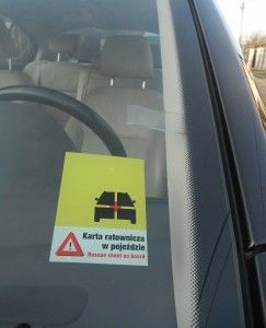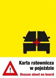 Służba ratownicza musi wiedzieć, że w samochodzie znajduje się Karta ratownicza. Temu służy umieszczenie na samochodzie specjalnej nalepki. Nalepkę informującą należy przykleić od wnętrza pojazdu w lewym dolnym rogu szyby (od strony kierowcy).