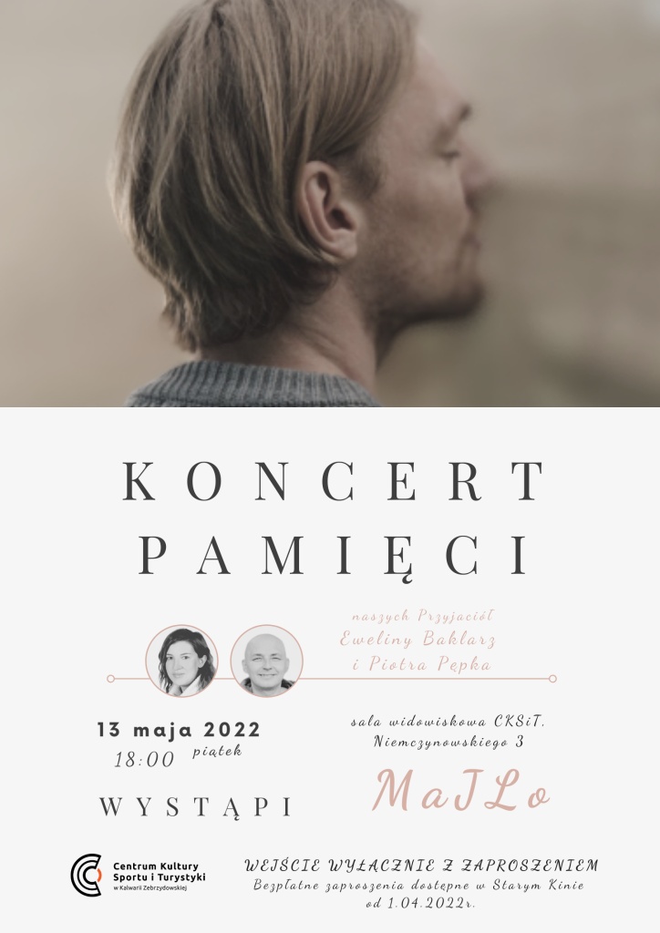 13 maja br. odbędzie się koncert wyjątkowego artysty - na naszej scenie wystąpi MaJLo. Wydarzenie ma upamiętniać naszych zmarłych przed rokiem Przyjaciół - Ewelinę Baklarz i Piotra Pępka, pracowników kalwaryjskiego Centrum Kultury.