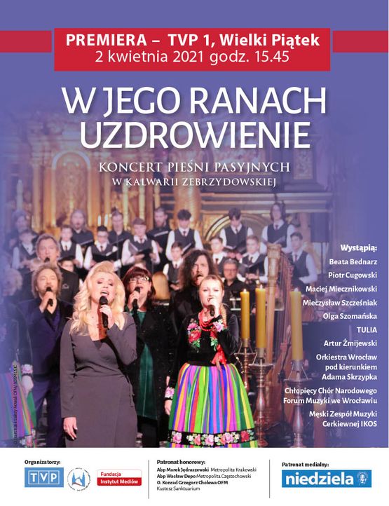 W Wielki Piątek (2 kwietnia) o godz. 15.45 na antenie TVP1 zostanie wyemitowany koncert pieśni pasyjnych „W Jego ranach uzdrowienie”. Będzie można usłyszeć pieśni o Męce Pańskiej w wykonaniu polskich artystów. Nagranie koncertu miało miejsce 10. marca w bazylice kalwaryjskiej.