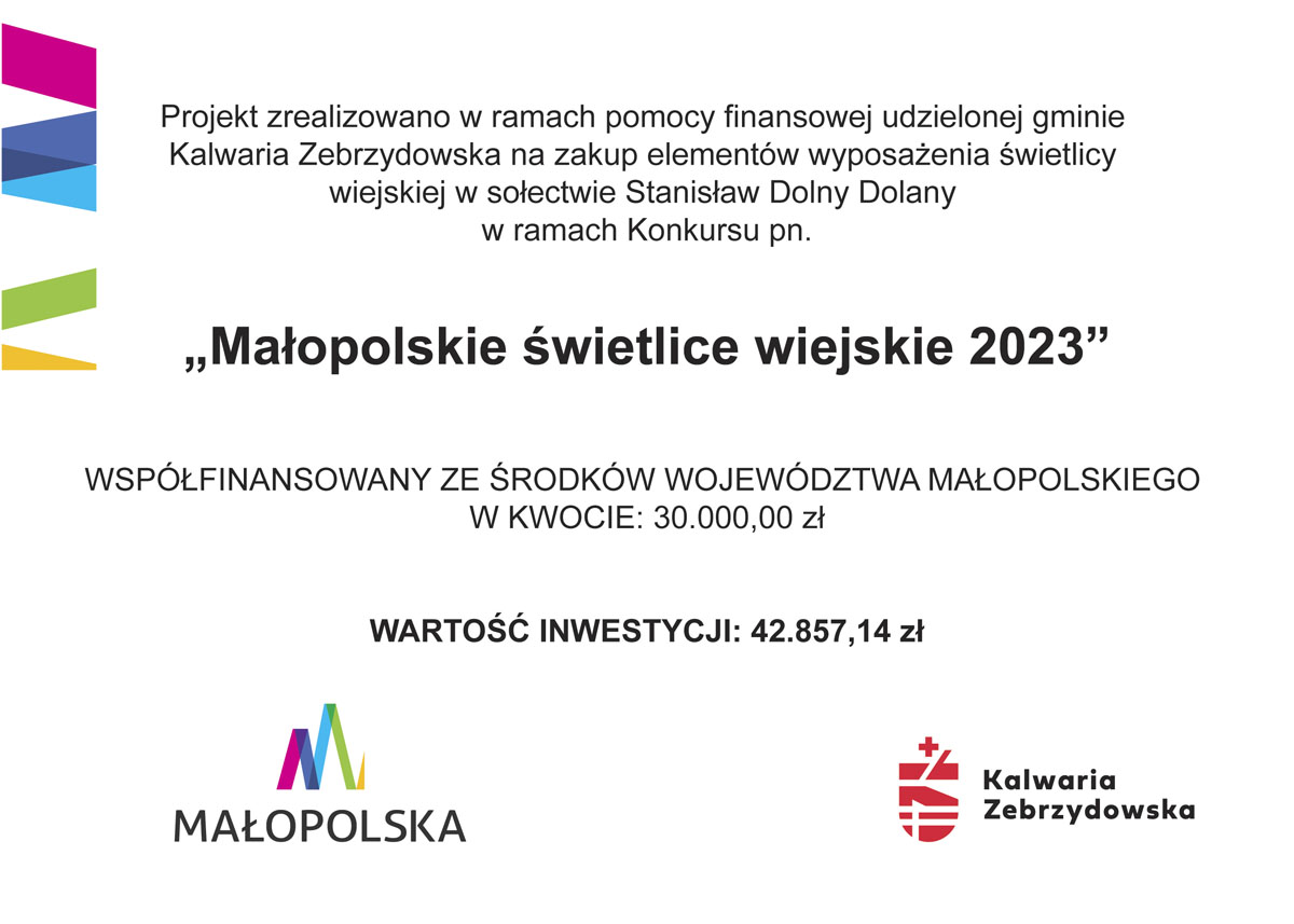 Zadanie współfinansowane ze środków finansowych Województwa Małopolskiego w ramach konkursu pn. „Małopolskie świetlice wiejskie 2023”.