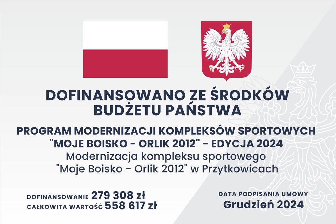Dofinansowano ze środków Funduszu Rozwoju Kultury Fizycznej, których dysponentem jest Minister Sportu i Turystyki w ramach Programu modernizacji kompleksów sportowych „Moje Boisko - Orlik – 2012” – Edycja 2024.
