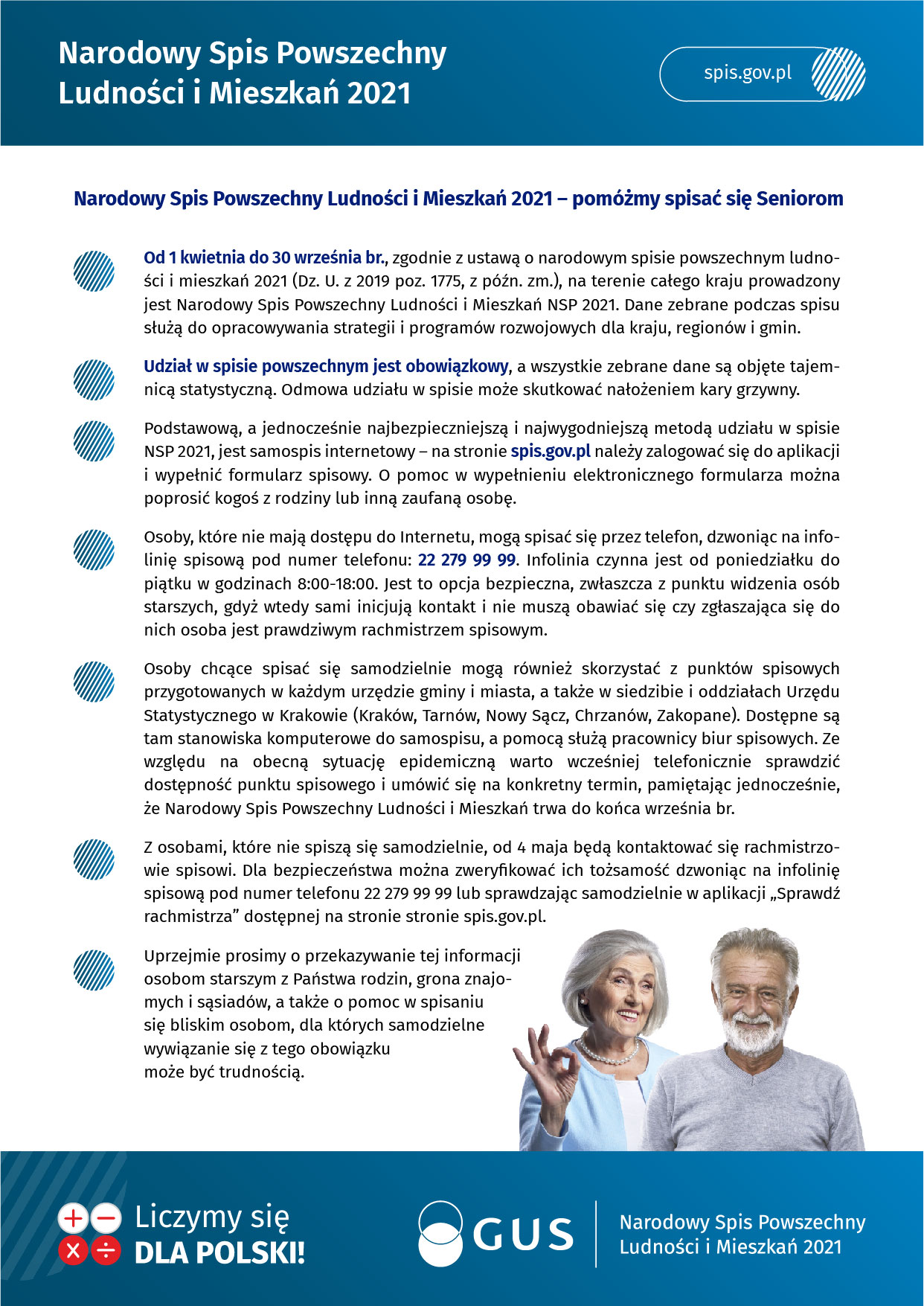 Szanowni Państwo, w okresie od 1 kwietnia do 30 września br. Główny Urząd Statystyczny prowadzi Narodowy Spis Powszechny Ludności i Mieszkań 2021. Dane zebrane podczas spisów służą do opracowywania strategii i programów rozwojowych dla kraju, regionów i gmin.