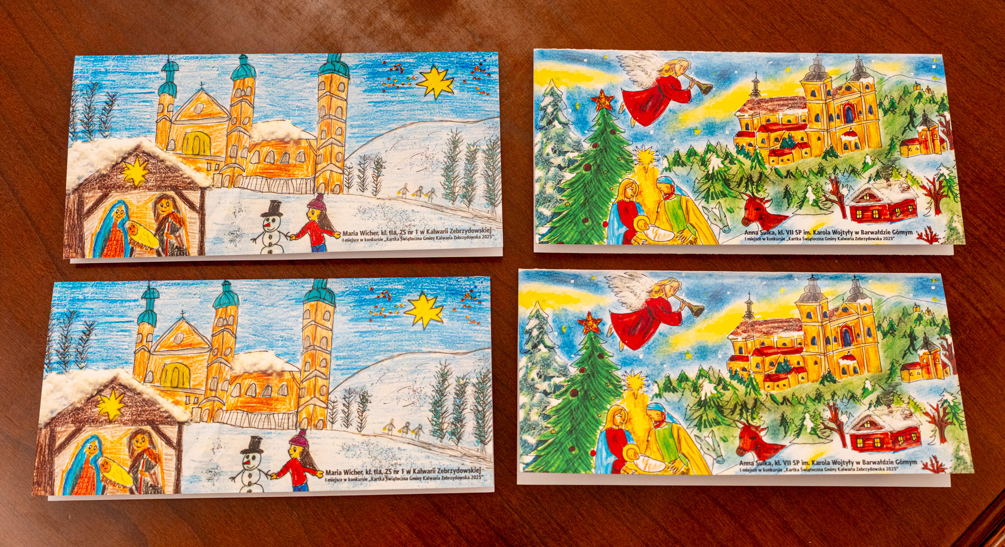 • po 1 zwycięskiej pracy w każdej kategorii wiekowej – projekty te zostały już profesjonalnie wydrukowane i staną się oficjalnymi kartkami świątecznymi Gminy Kalwaria Zebrzydowska 2025,