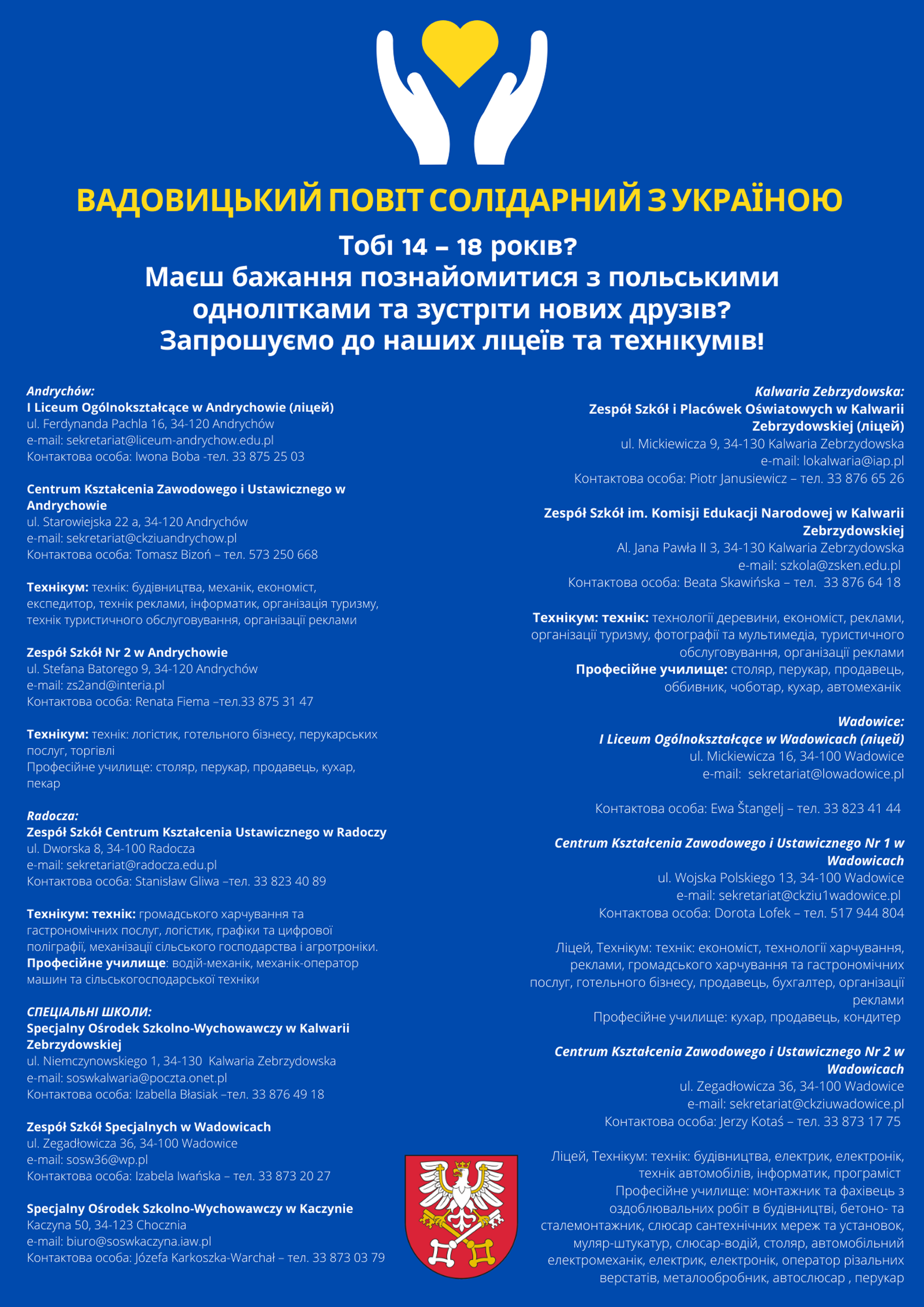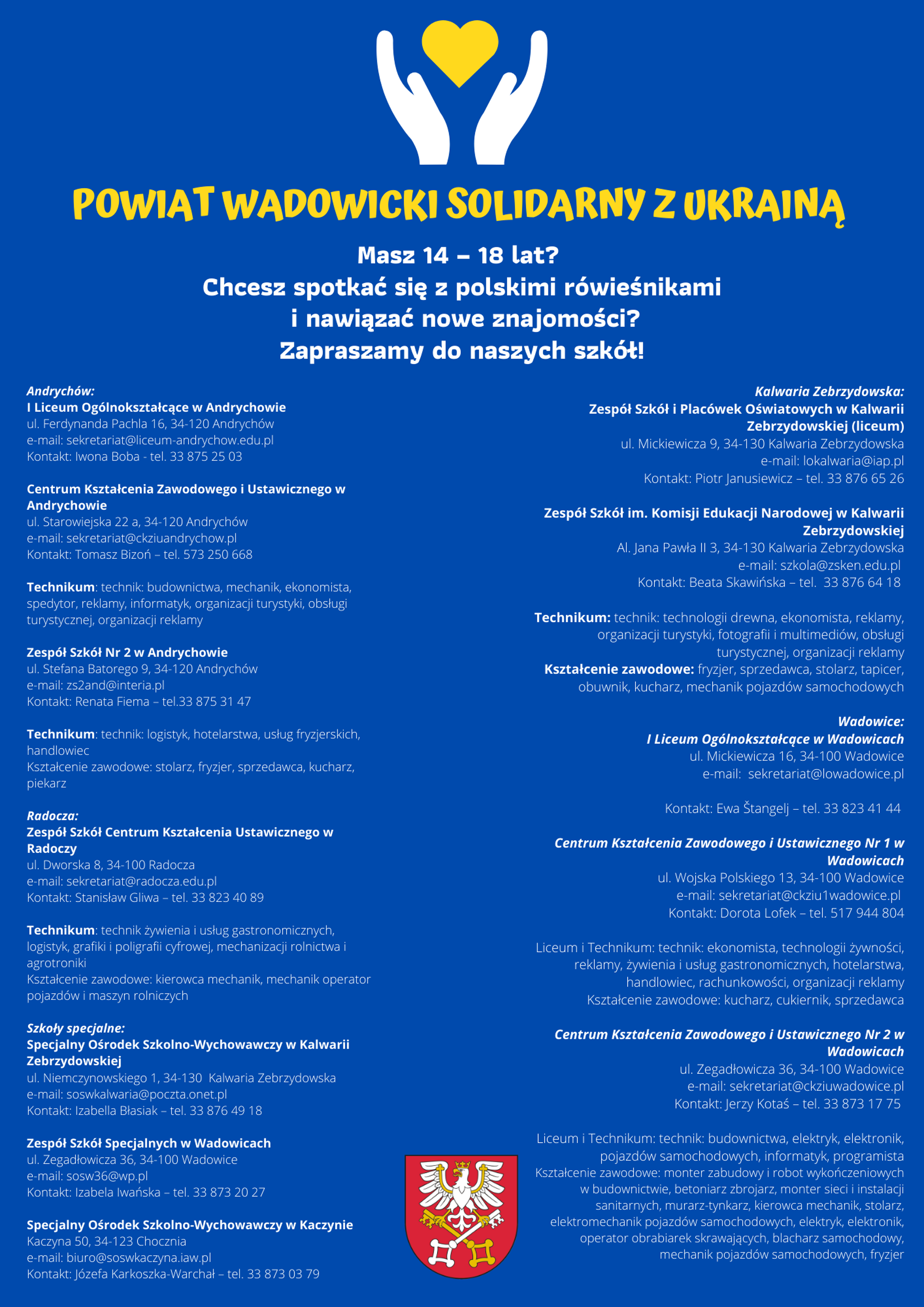 Вадовицький повіт солідарний з Україною - афішаPowiat_Wadowicki_szkoły_ulotka.pdf 0.34MB Powiat wadowicki solidarny z Ukrainą - plakat