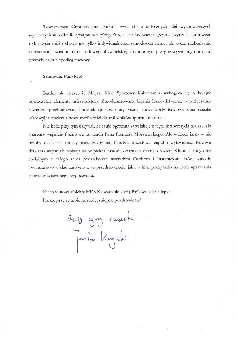 Wszystkim osobom i instytucjom, które przyczyniły się do modernizacji tego miejsca, chciałbym podziękować. Dziękuje za pomoc w kreowaniu pozytywnych przemian Gminy Kalwaria Zebrzydowska. Jako samorząd dziękujemy za udział w naszych przedsięwzięciach oraz wsparcie i ofiarność. Mam nadzieję że, dotychczasowa współpraca zaowocuje i przyczyni się do dalszego rozwoju naszej Małej Ojczyzny – mówił Burmistrz Miasta Augustyn Ormanty i dodaje Systematycznie inwestujemy w to miejsce, tak aby tętniło sportowym życiem i stało się sportową wizytówką gminy.