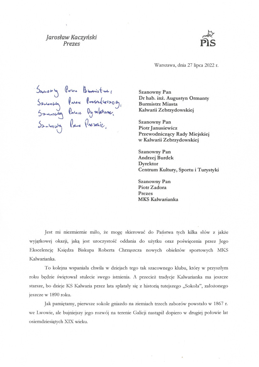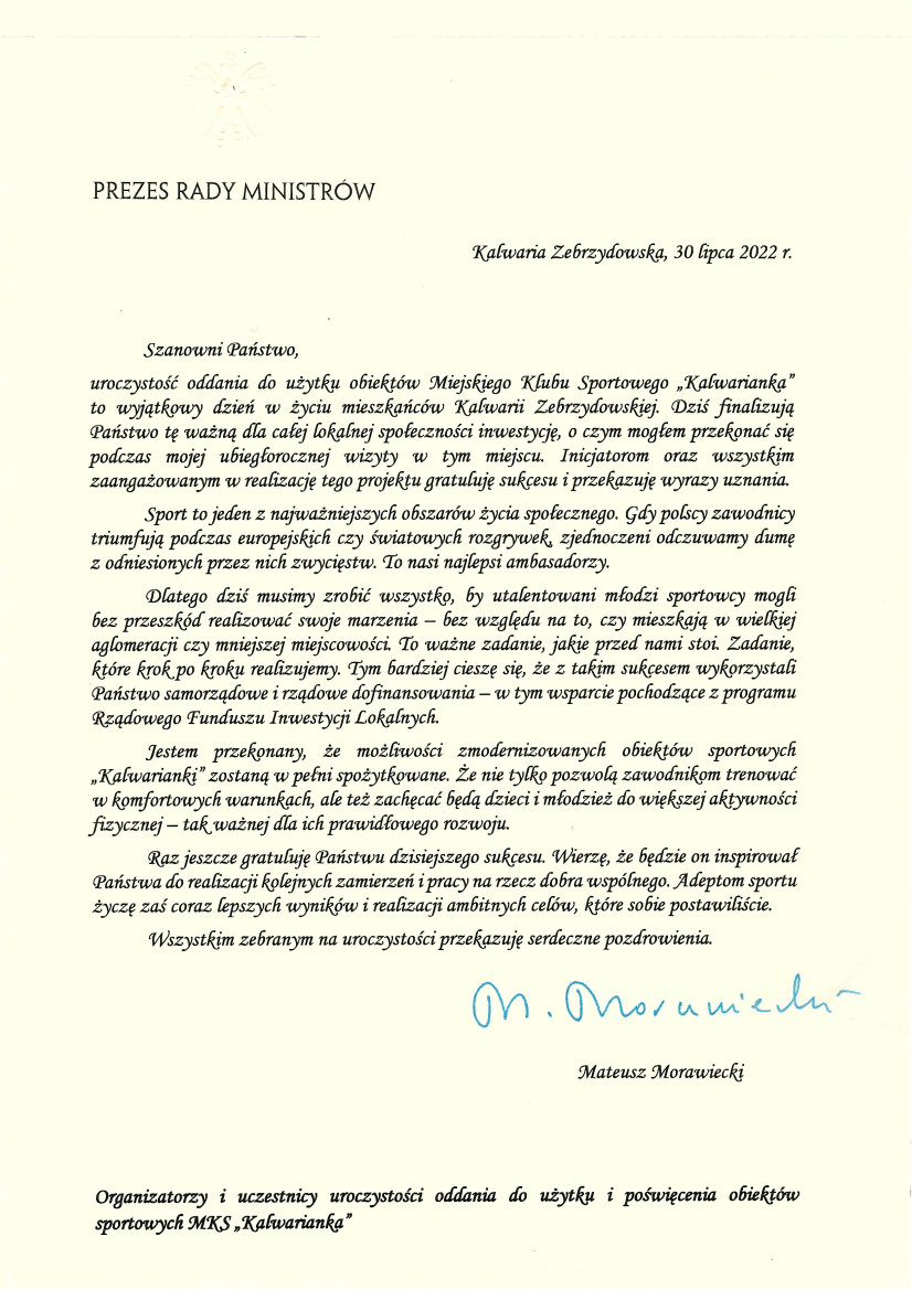 Okolicznościowy list, który odczytał Poseł Filip Kaczyński wystosował Premier Mateusz Morawiecki, w którym przywołał wizytę w tym miejscu i decyzje jakie przyczyniły się do imponujących remontów w tym miejscu.