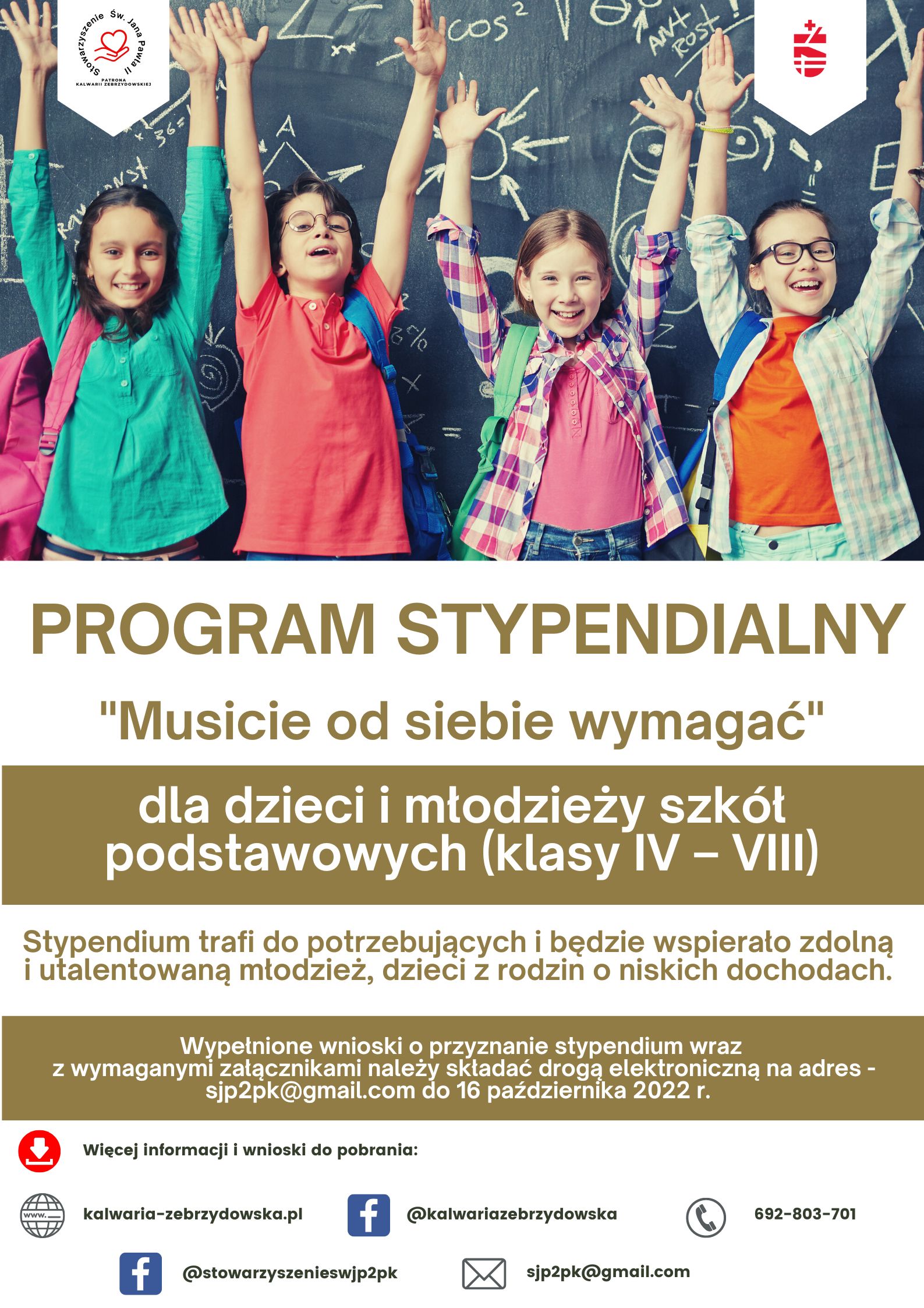 Stowarzyszenie im. Świętego Jana Pawła II Patrona Kalwarii Zebrzydowskiej zachęca dzieci i młodzież z terenu Gminy Kalwaria Zebrzydowska, do udziału w programie stypendialnym "Musicie od siebie wymagać"