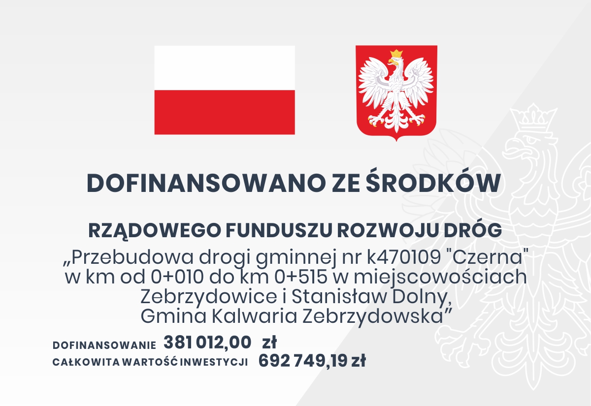 Tytuł: Przebudowa drogi gminnej nr K470109 „Czerna” w km od 0+010 do km 0+515 w miejscowościach Zebrzydowice i Stanisław Dolny, gmina Kalwaria Zebrzydowska - ogłoszenie o zamówieniu