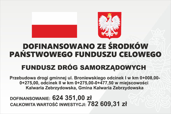 Tytuł: Przebudowa drogi gminnej ul. Broniewskiego odcinek I w km 0+008 - 0+275, odcinek II w km 0+275 - 0+477,5 w miejscowości Kalwaria Zebrzydowska, Gmina Kalwaria Zebrzydowska