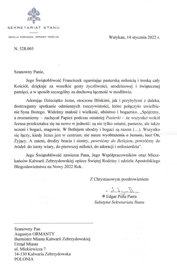 Jego Świątobliwość zawierza Pana, Jego Współpracowników oraz Mieszkańców Kalwarii Zebrzydowskiej opiece Świętej Rodziny i udziela Apostolskiego Błogosławieństwa na Nowy 2022 Rok.