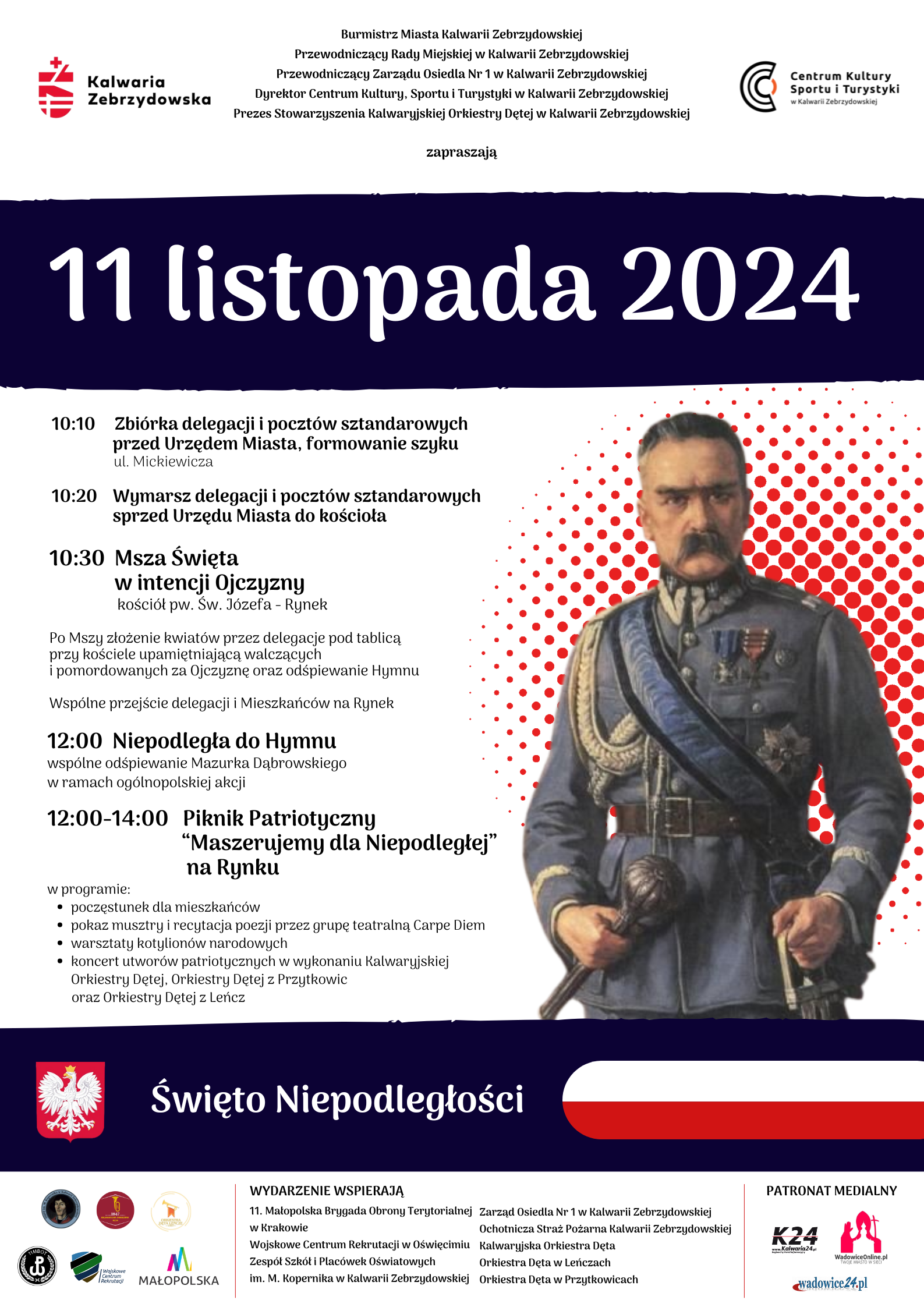 Burmistrz Miasta Kalwarii Zebrzydowskiej, Przewodniczący Rady Miejskiej w Kalwarii Zebrzydowskiej, Przewodniczący Zarządu Osiedla Nr 1 w Kalwarii Zebrzydowskiej, Dyrektor Centrum Kultury, Sportu i Turystyki w Kalwarii Zebrzydowskiej oraz Prezes Stowarzyszenia Kalwaryjskiej Orkiestry Dętej serdecznie zapraszają na obchody Święta Niepodległości, które odbędą się 11 listopada 2024 roku.