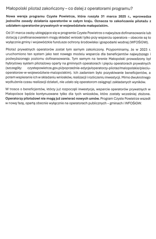 Operatorzy, czyli firmy prywatne, które działały we wcześniejszych edycjach – obecnie nie mogą już działać w Państwa imieniu, mogą jedynie kontynuować inwestycje, które zostały rozpoczęte w ramach wcześniejszych edycji, czyli przed 31 marca 2025 r.