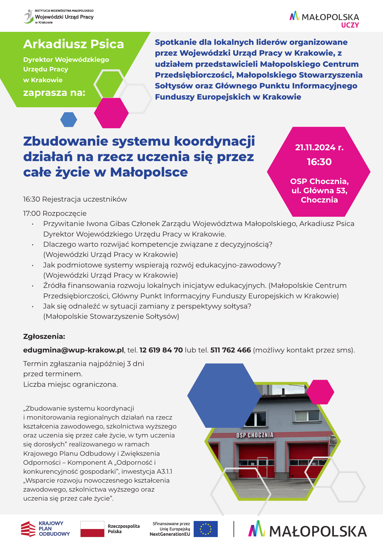 Wojewódzki Urząd Pracy w Krakowie organizuje kolejne spotkanie dedykowane lokalnym Liderom – warsztat poświęcony budowaniu systemu koordynacji działań na rzecz uczenia się przez całe życie w Małopolsce.