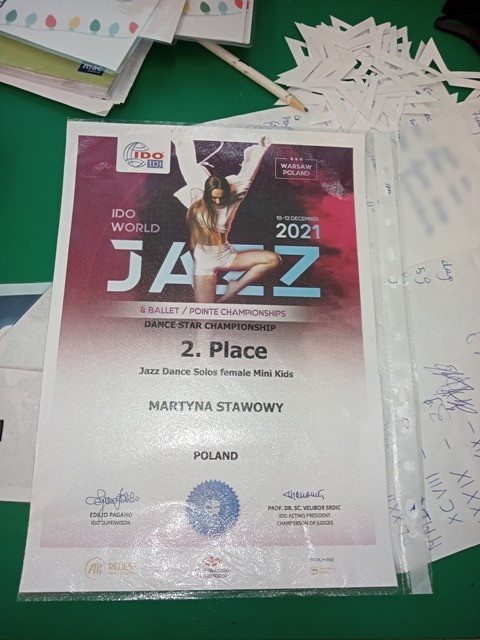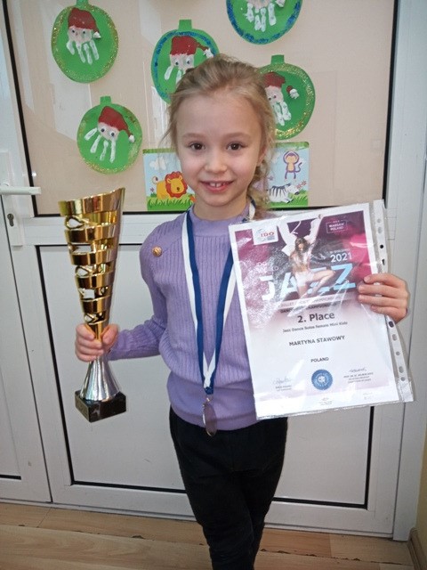 Martyna Stawowy, uczęszczająca do Przedszkola w Barwałdzie Średnim, podczas zawodów tanecznych IDO Jazz Mini Kids - Pierwszych Mistrzostwach Świata w Warszawie, które odbyły się 11.12.2021 - zdobyła Wicemistrzostwo Świata. Gratulujemy Martynce i Jej Rodzicom wspaniałego sukcesu oraz życzymy dalszych osiągnięć i wytrwałości w trudnych i wymagających treningach.