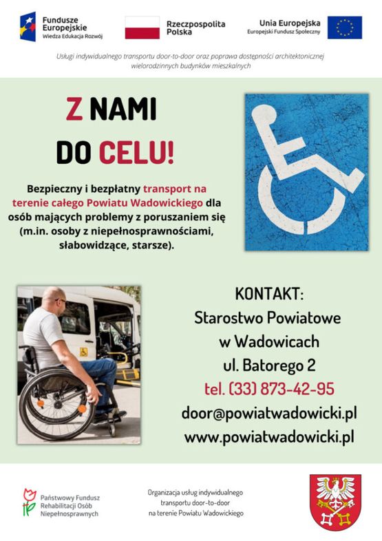 Beneficjenci programu będą mieli zapewniony przewóz z miejsca zamieszkania do punktu docelowego, który wskażą np. do zakładów pracy, placówek służby zdrowia, gabinetów rehabilitacyjnych, urzędów bądź innych miejsc użyteczności publicznej. Z usług transportowych będą mogły korzystać nie tylko osoby posiadające orzeczenie o stopniu niepełnosprawności, ale każdy pełnoletni mieszkaniec Powiatu Wadowickiego, który ma problemy z mobilnością i poruszaniem się. Celem projektu jest wprowadzenie nowej jakości usług transportowych, szczególnie na obszarach wiejskich, w których dostęp do placówek służby zdrowia, gabinetów rehabilitacyjnych, a także do zakładów pracy na otwartym rynku jest utrudniony.