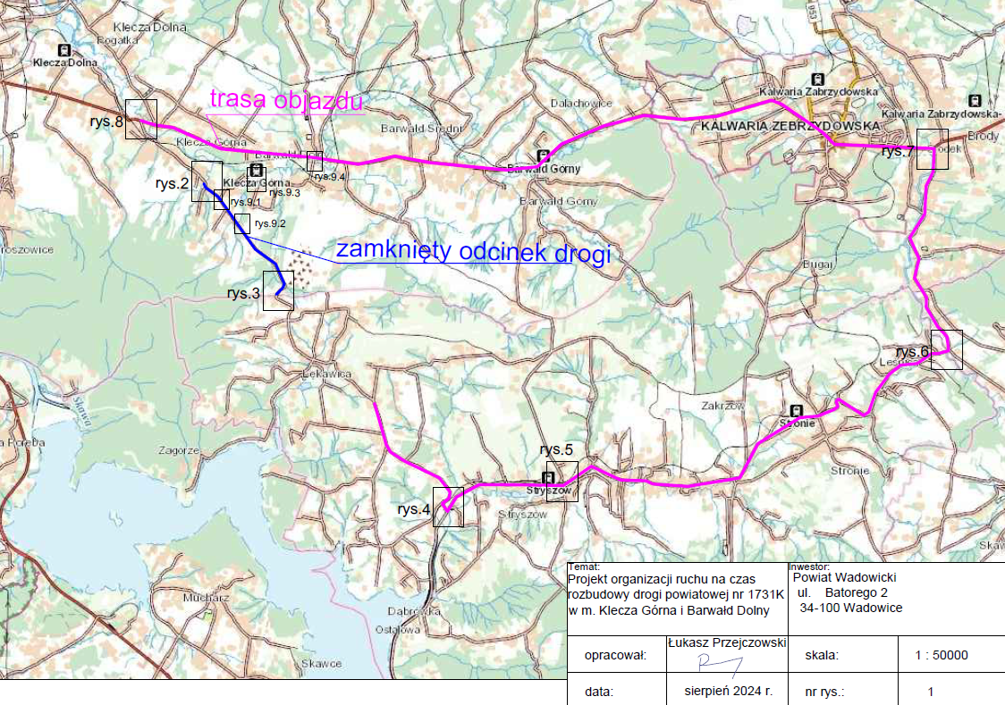 Wykonawca robót firma PBDM „DROG-BUD” Spytkowice realizująca na zlecenie Starostwa Powiatowego w Wadowicach rozbudowę drogi powiatowej nr 1731K w miejscowościach Klecza Górna i Barwałd Dolny zawiadamia o wprowadzeniu zmian w organizacji ruchu na ww. drodze. W związku z prowadzonymi robotami droga będzie nieprzejezdna w dniach 29 sierpnia br. od godz. 7.00 do 30 sierpnia br. do godz. 18.00.
