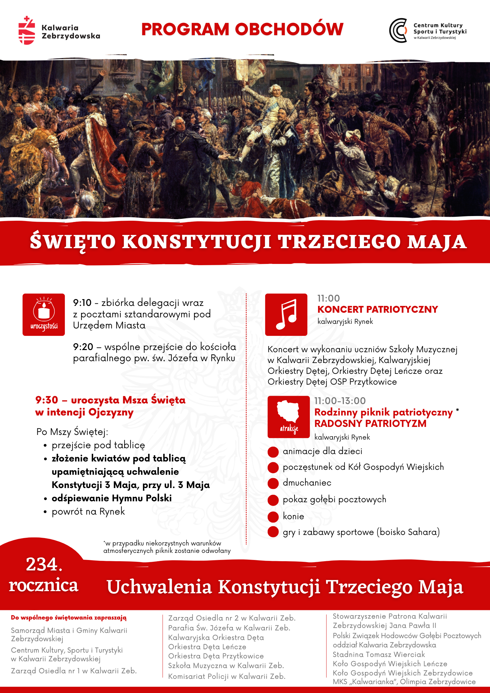 Serdecznie zapraszamy wszystkich mieszkańców Gminy Kalwaria Zebrzydowska do wspólnego świętowania 234. rocznicy uchwalenia Konstytucji 3 Maja – jednego z najważniejszych wydarzeń w historii Polski.