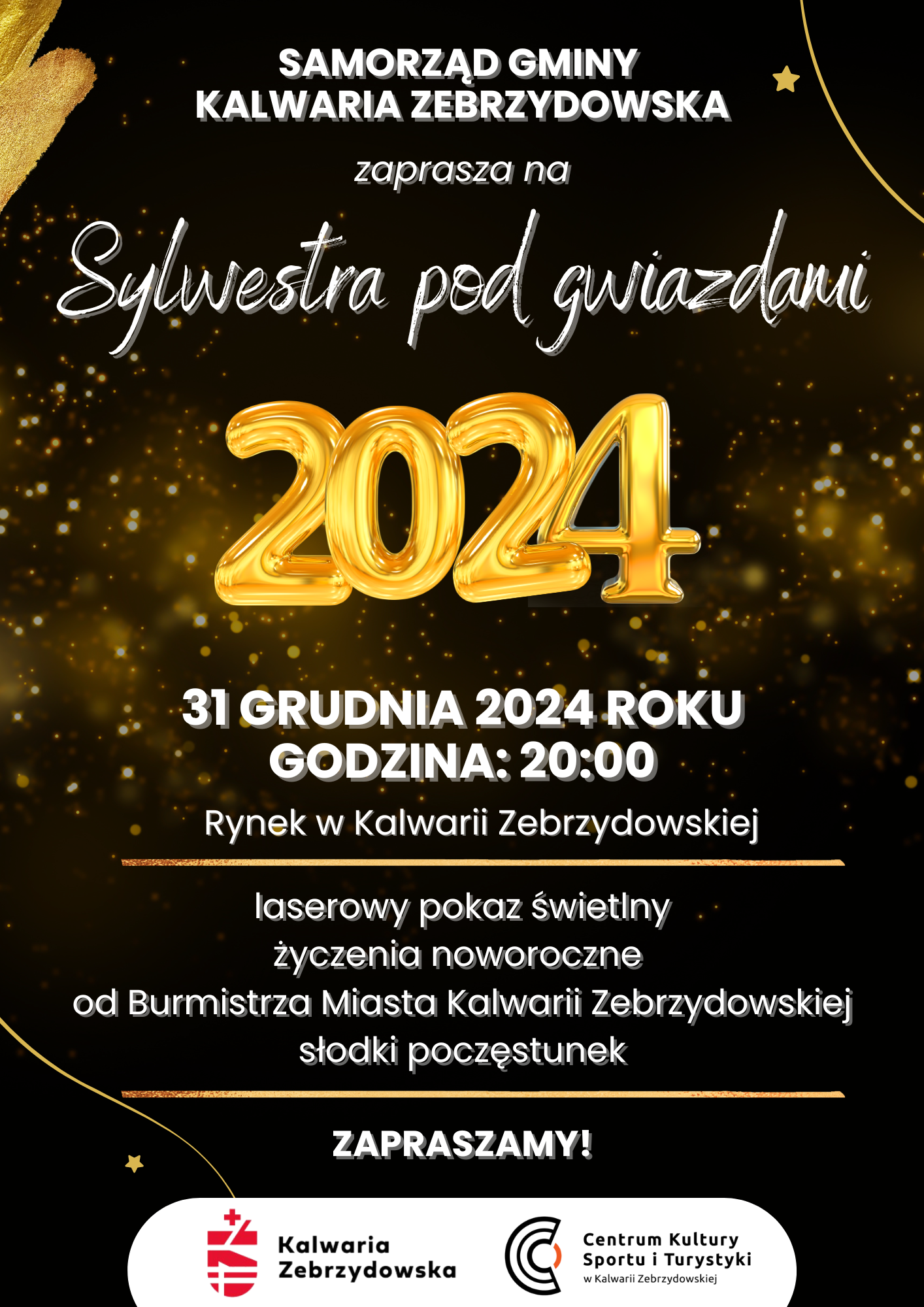 Burmistrz Kalwarii Zebrzydowskiej serdecznie zaprasza wszystkich mieszkańców na Sylwestrowy Pokaz Laserowy, który odbędzie się 31 grudnia 2024 roku o godzinie 20:00 na rynku w Kalwarii Zebrzydowskiej.