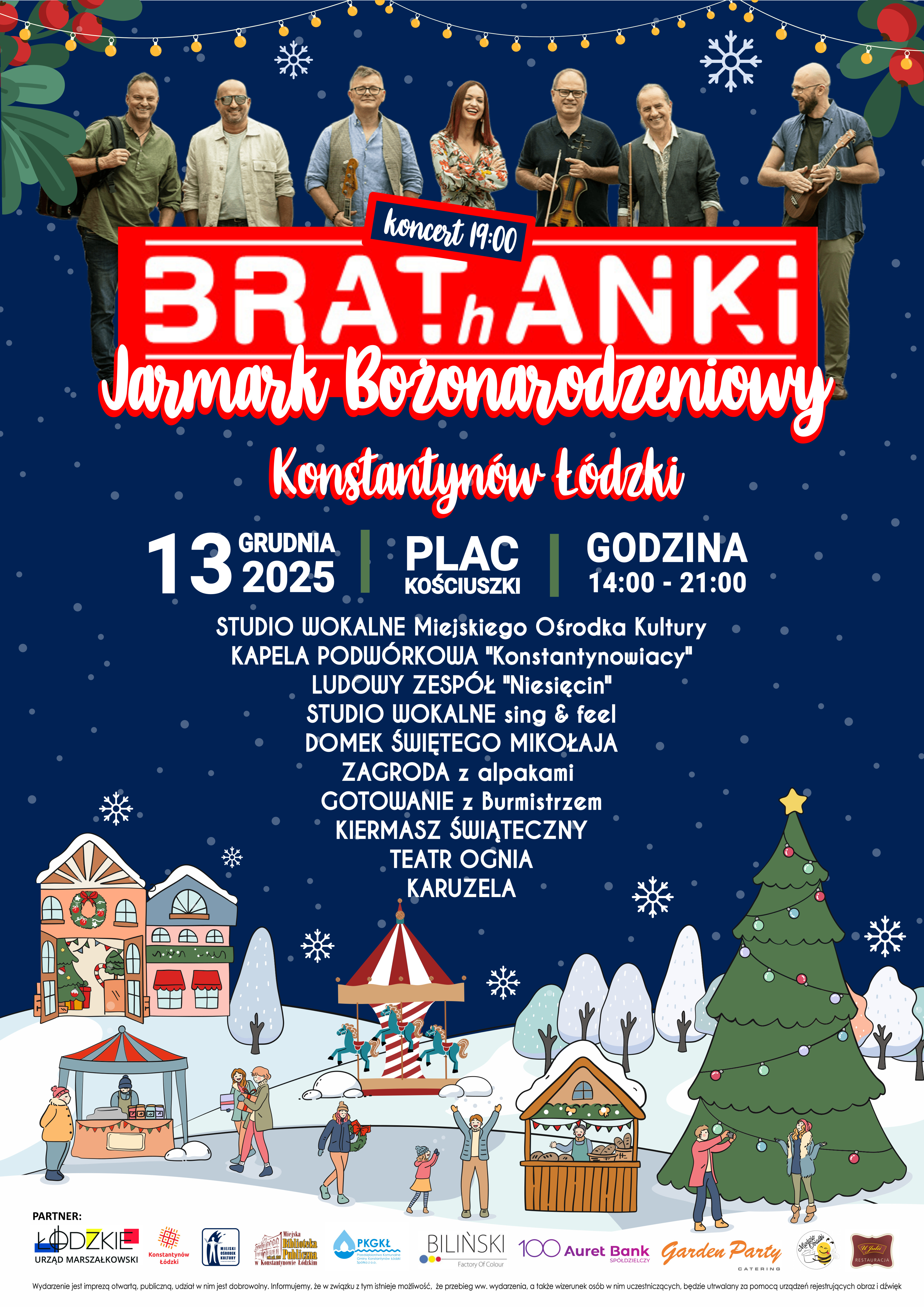 Każde dziecko będzie mogło szepnąć mu do ucha, jakie ma marzenia i co chce dostać pod choinkę. Na Jarmarku usłyszymy na żywo „Czerwone Korale”, bo przyjedzie do nas z koncertem folkowo-rockowa grupa Brathanki. Zespół od ponad 25 lat bawi nas swoimi przebojami. Założyciel grupy akordeonista i wokalista Janusz Mus wystąpi z wokalistką Agnieszką Dyk-Florkowską. Brathanki to też świetni muzycy: Stefan Błaszczyński (flet), Adam Prucnal (skrzypce, instr. klawiszowe), Piotr Królik (perkusja), Grzegorz Piętak (gitara basowa) i Wiktor Tatarek (gitara). Na scenie wystąpią również nasze utalentowane dzieci ze Studia wokalnego Sing&Feel Iwony Starkowskiej. Usłyszymy Kapelę Podwórkową Konstantynowiacy, która zagra znane i lubiane utwory ze swojego repertuaru. Wystąpią panie z Ludowego Zespołu Niesięcin.