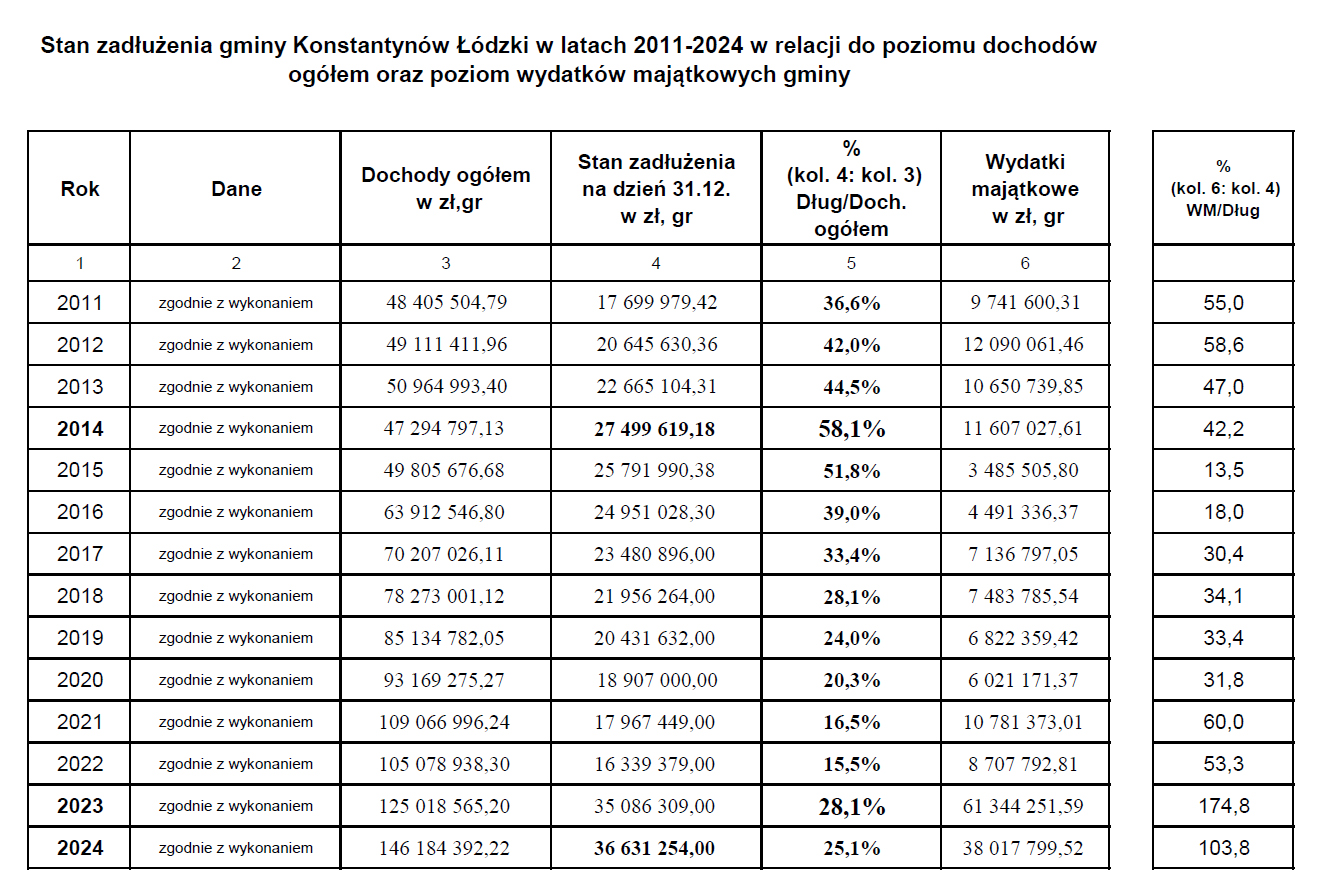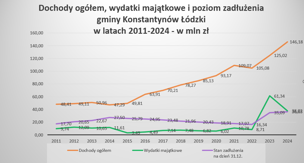 Dochody ogółem miasta w 2024 roku wyniosły 146 184 392,22 złotych. Zadłużenie miasta spadło do 25,1 procenta. To dobra wiadomość dla mieszkańców, bo dziesięć lat temu wyniosło aż 58,1 procenta.
