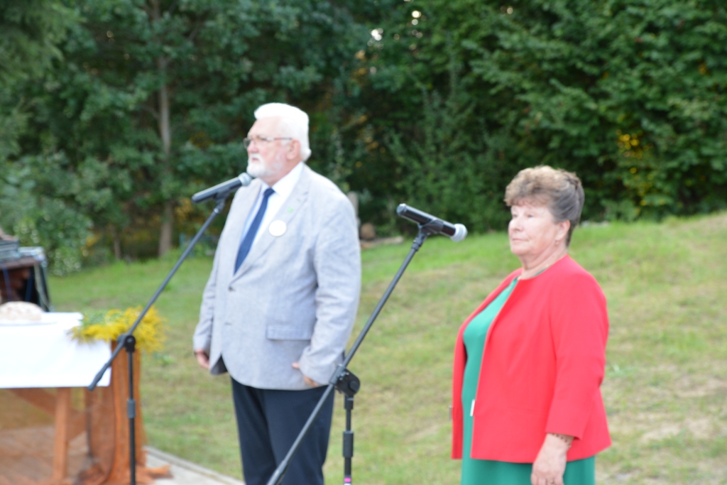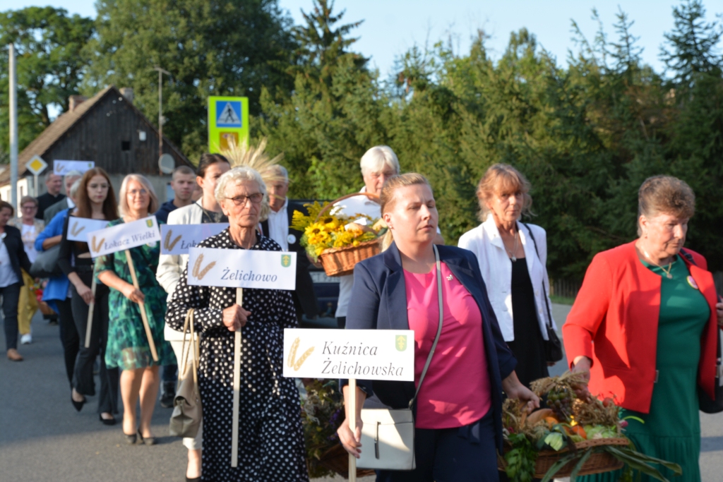 Wydarzenie rozpoczęła msza święta w kościele filialnym NSPJ, którą odprawił ks. proboszcz Zbigniew Stoltman. Sołectwa złożyły na ołtarz dary w postaci koszy dziękczynnych oraz wspólnego wieńca dożynkowego. Następnie, korowód w asyście krzyskiej orkiestry dętej, przeszedł na plac przy sali wiejskiej, gdzie odbył się tradycyjny obrzęd. Rozpoczęło go uroczyste otwarcie imprezy, którego dokonała Stanisława Bździel, sołtyska wsi Kuźnica Żelichowska, która była współgospodarzem święta, a także burmistrz Krzyża Wielkopolskiego Rafał Sroka. Wspólnie wyrazili uznanie dla rolników, sadowników i działkowców, życząc tym samym powodzenia i wytrwałości w ciężkiej pracy. Jednym z najważniejszych symboli dożynkowych jest bochen chleba. Starostowie dożynek, państwo Agnieszka i Andrzej Kurachowie, podzielili go wspólnie z burmistrzem między zgromadzonymi uczestnikami święta plonów. Państwo Kurachowie mieszkają i prowadzą gospodarstwo rolne w Kuźnicy Żelichowskiej. Uprawiają zboża oraz hodują bydło i kozy.