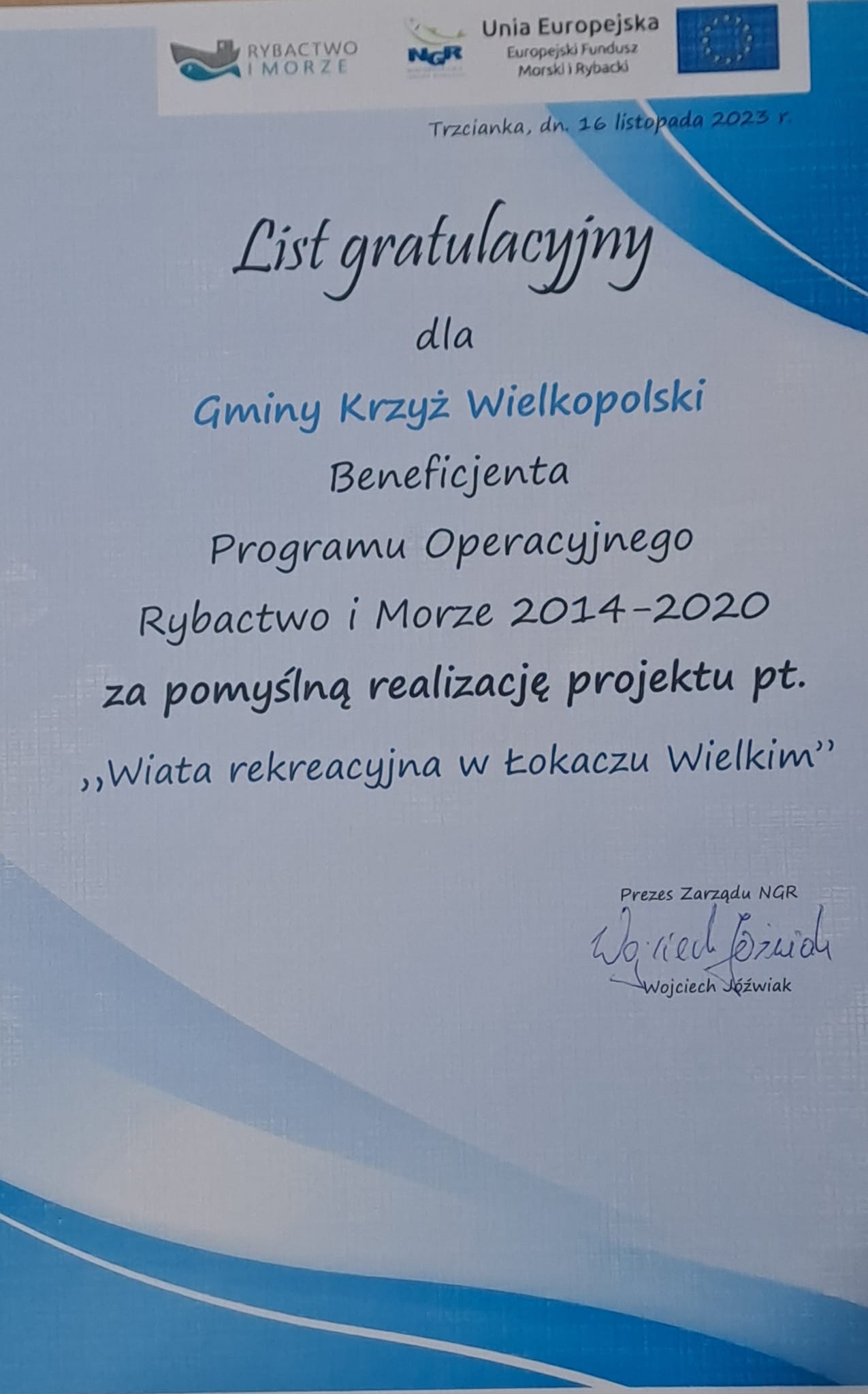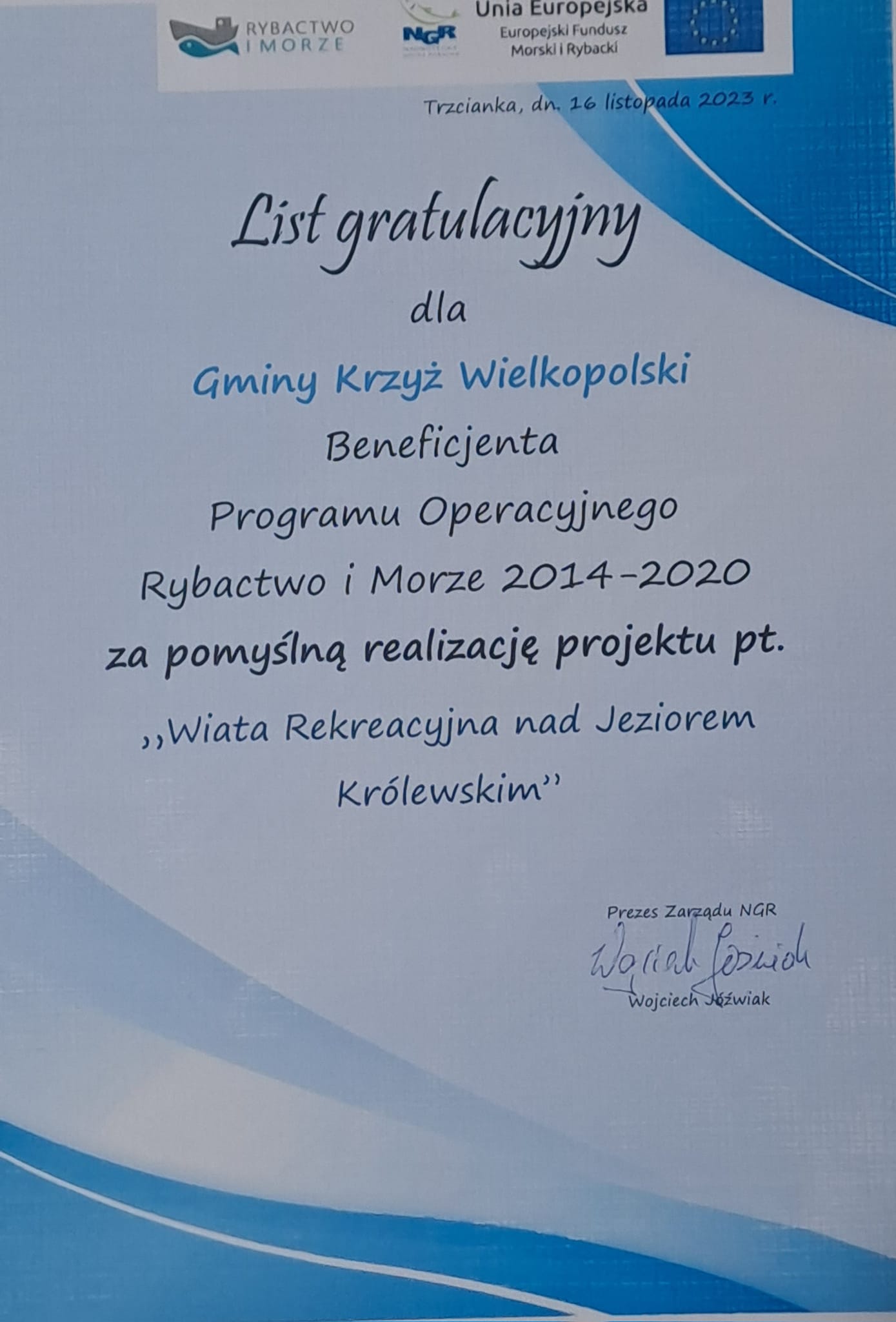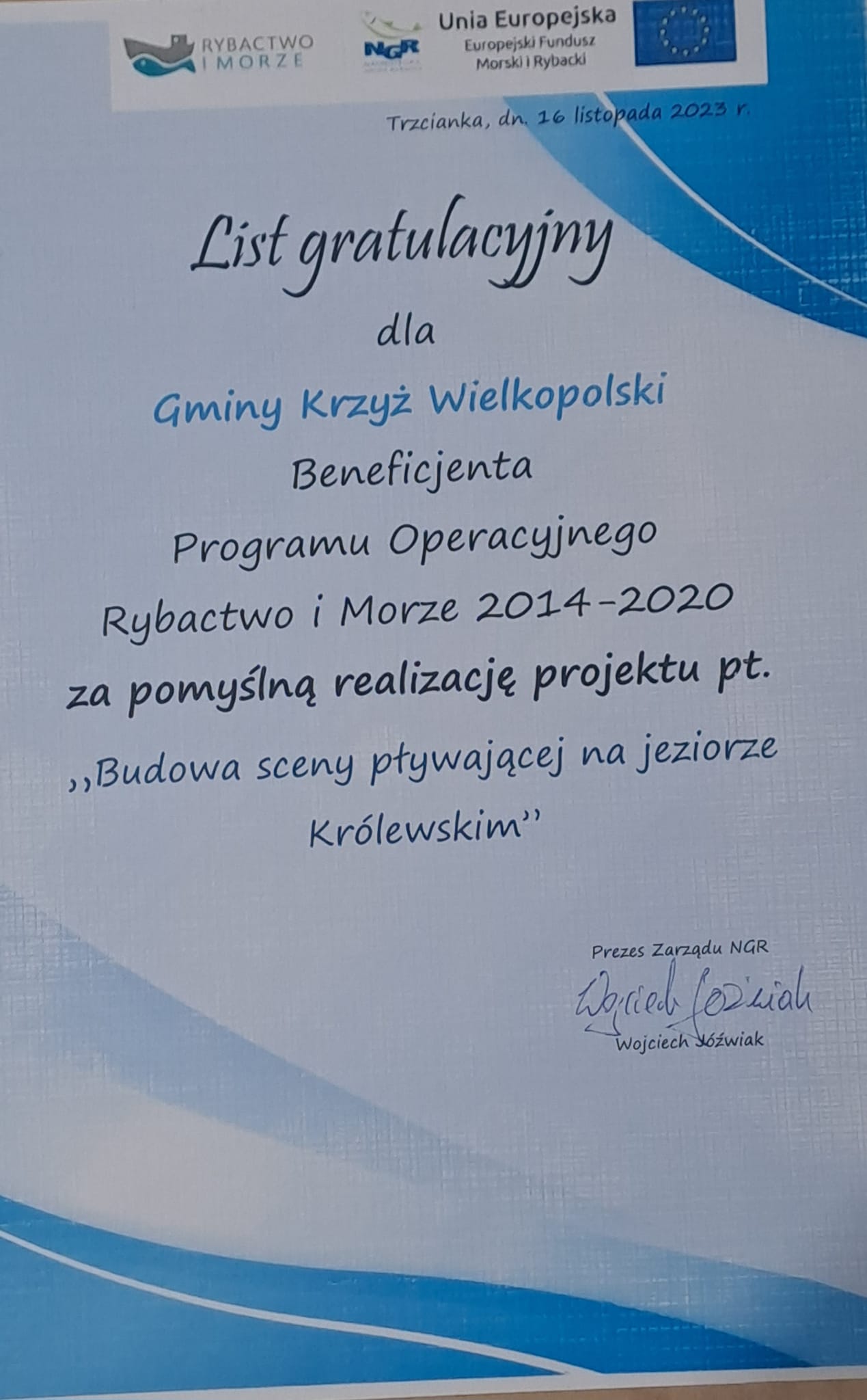 16 listopada Gmina Krzyż Wielkopolski odebrała listy gratulacyjne za realizację projektów: "Budowa sceny pływającej na jeziorze Królewskim", "Wiata rekreacyjna w Łokaczu Wielkim", "Wiata rekreacyjna nad Jeziorem Krolewskim" w Programie Operacyjnym Rybactwo i Morze 2014-2020.