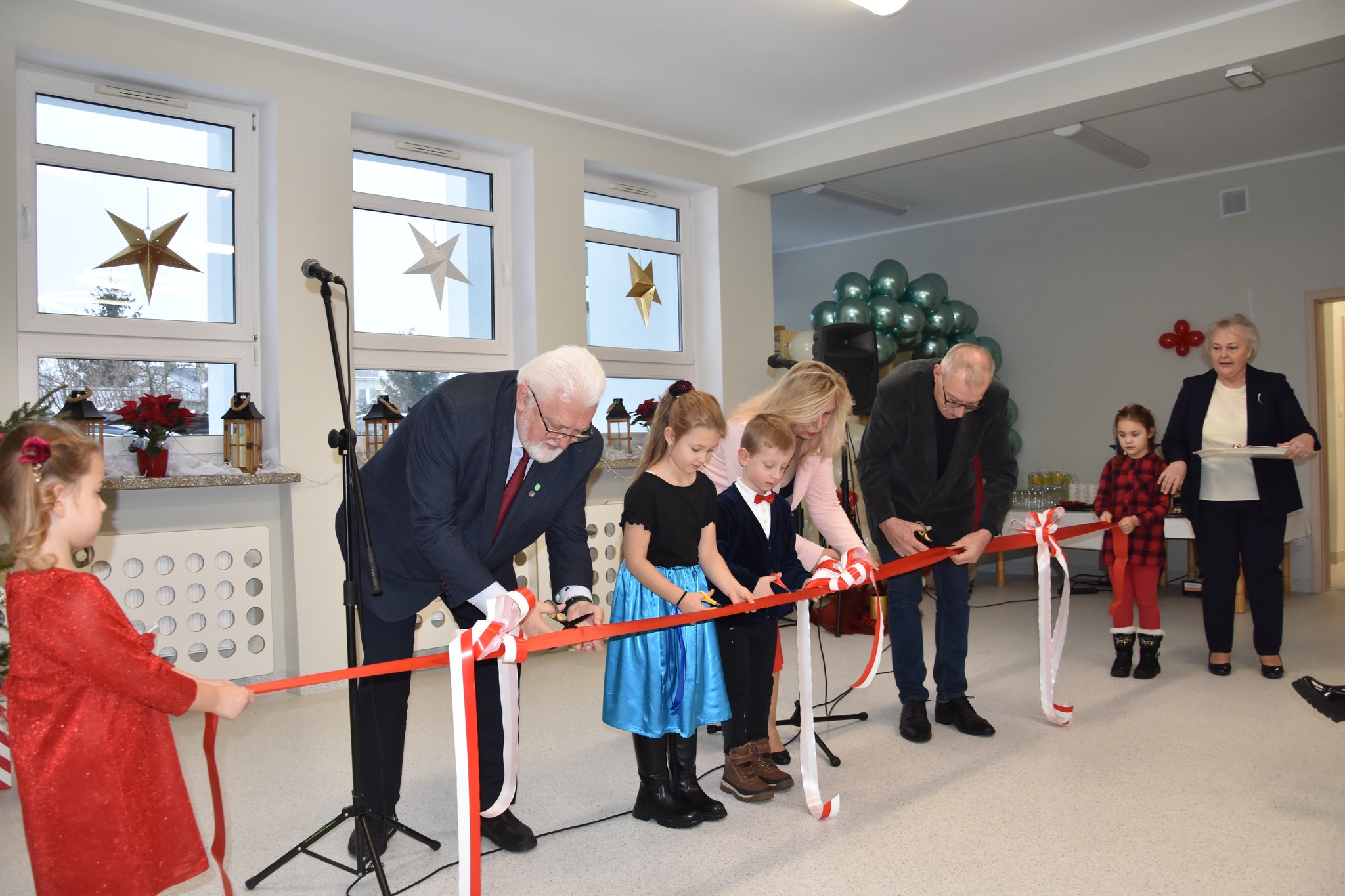 6 grudnia Dyrekcja wraz z Radą Rodziców zorganizowała uroczystość. Na początek Pan Burmistrz, Wiceprzewodniczący Rady Miejskiej, Pani Dyrektor wraz z dziećmi przecięli wstęgę. Zaproszono wielu gości, którzy mogli obejrzeć pokazy artystyczne dzieci, przekazać upominki i powiedzieć kilka słów. Po uroczystości Pan Burmistrz odwiedził jeszcze dzieci z Przedszkola nr 2 i Żłobka ze słodkimi mikołajkowymi upominkami.