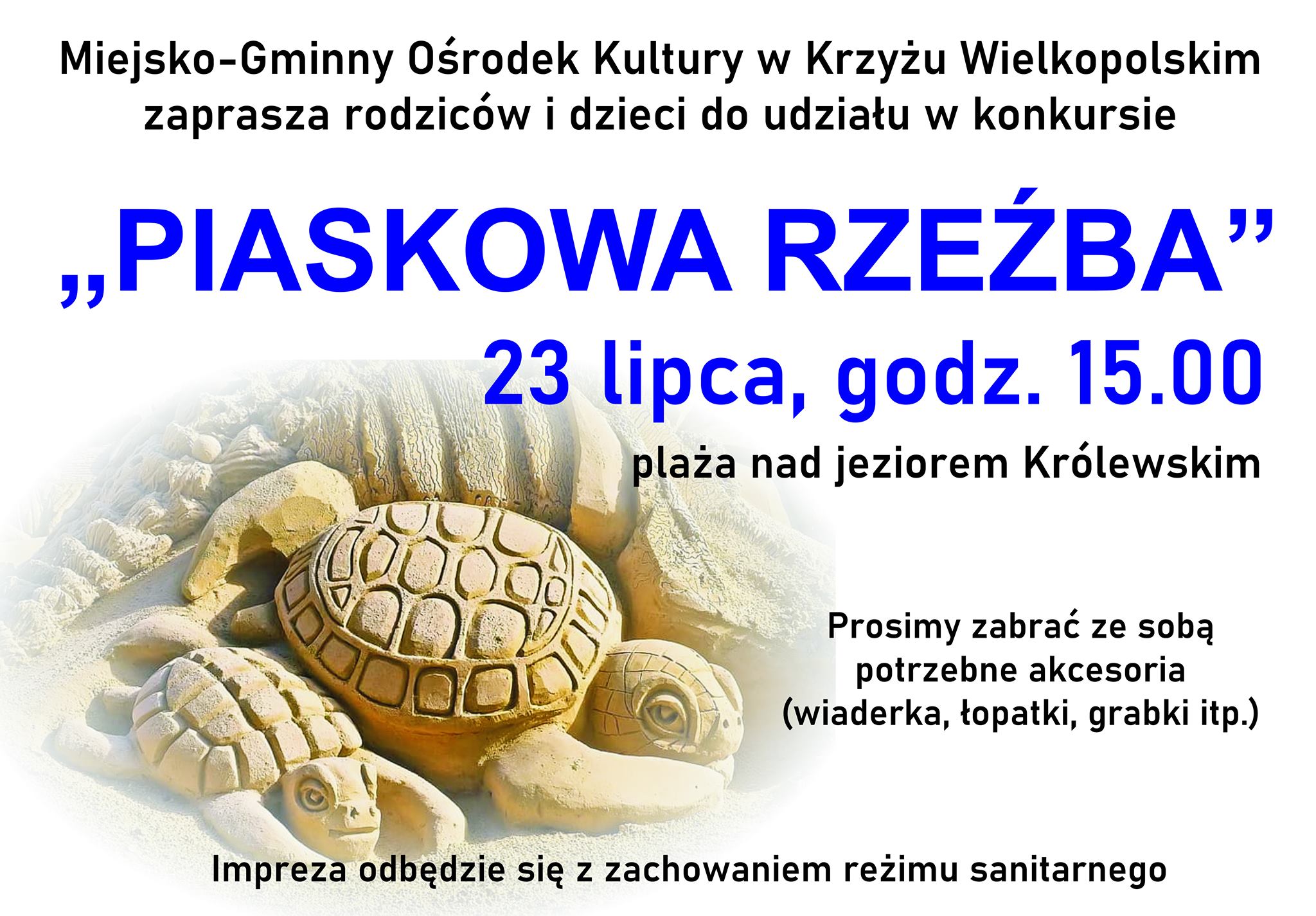 Zapraszamy dzieci i dorosłych do udziału w konkursie "Piaskowa rzeźba''. Spotykamy się w piątek o godz. 15:00 na plaży nad Jeziorem Królewskim. Zabierzcie ze sobą potrzebna akcesoria (wiaderka, grabie, łopatki).
