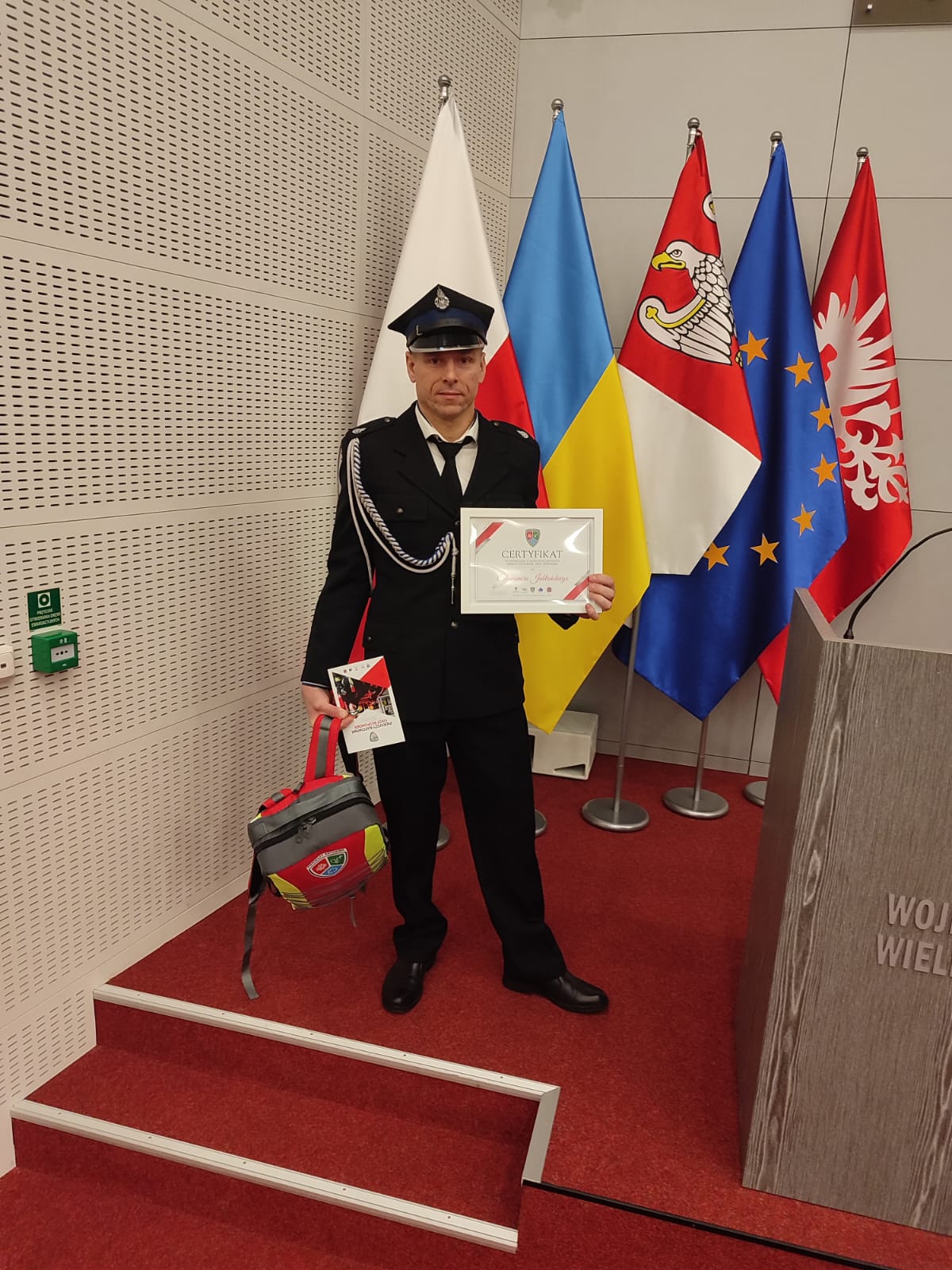 Sławomir Jabłoński – strażak Ochotniczej Straży Pożarnej w Kuźnicy Żelichowskiej otrzymał certyfikat ukończenia specjalnego kursu pn. „Pierwszy ratownik” oraz otrzymał modułową torbę wyposażoną w niezbędny sprzęt do ratowania życia i zdrowia.