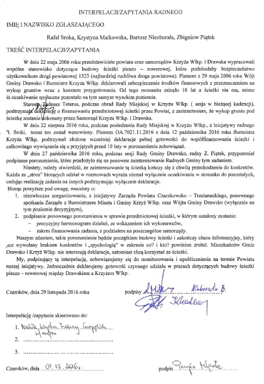 23 września 2022 r. zakończyła się inwestycja pn. "Rozbudowa drogi – budowa ścieżki rowerowej Krzyż Wielkopolski – Drawsko przy drodze powiatowej nr 1323P" i nastąpiło oficjalne otwarcie ścieżki.