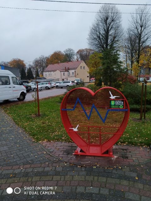 Czerwony pojemnik w kształcie serca przeznaczony do zbierania plastikowych nakrętek pojawił się w Krzyżu Wielkopolskim, w Parku Miejskim przy fontannie.