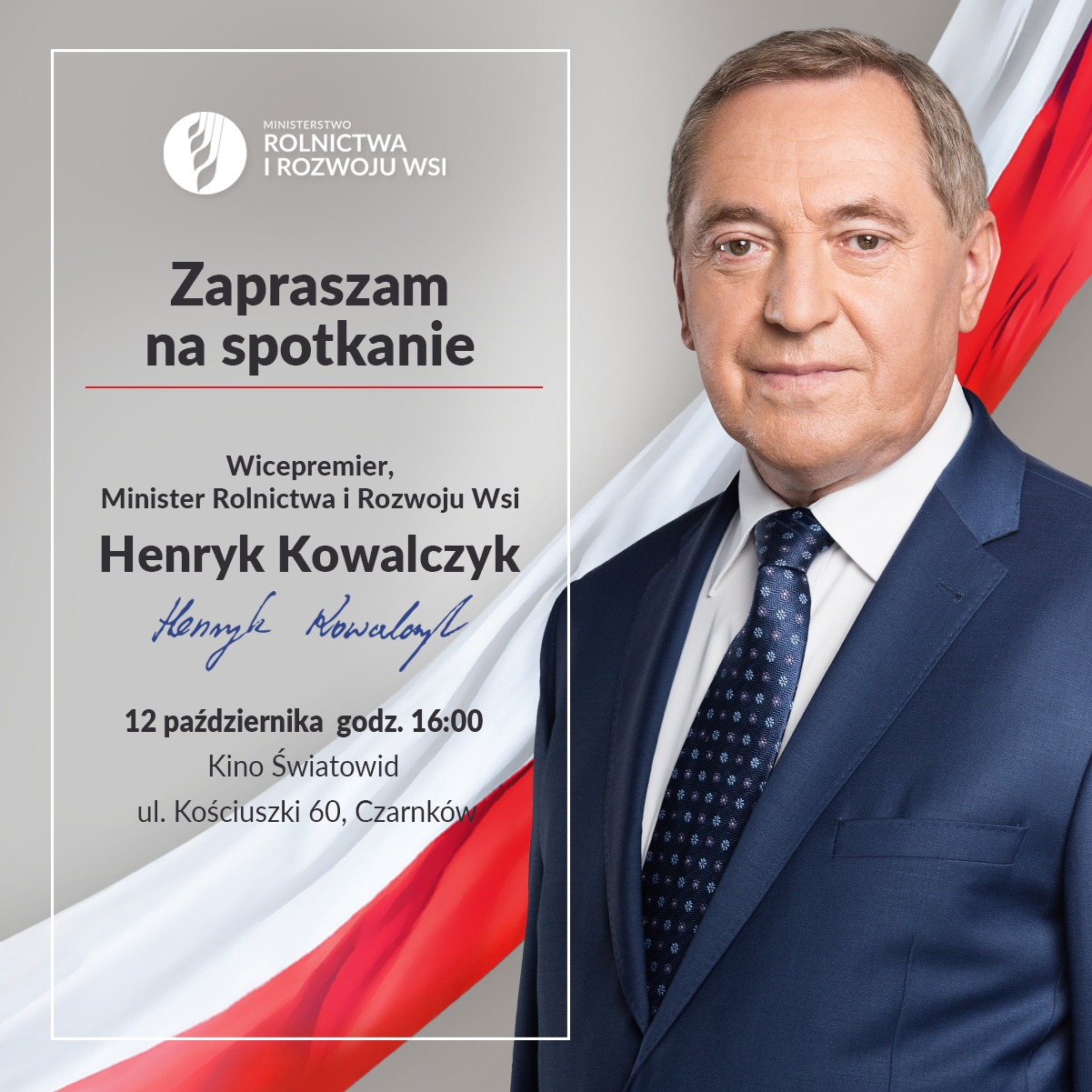 12 października 2022r. o godz. 16:00 w Kinie Światowid w Czarnkowie odbędzie się otwarte spotkanie z Wicepremierem, Ministrem Rolnictwa i Rozwoju Wsi Henrykiem Kowalczykiem.