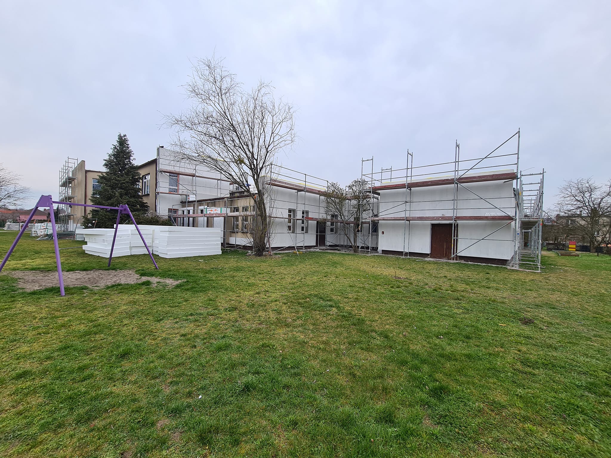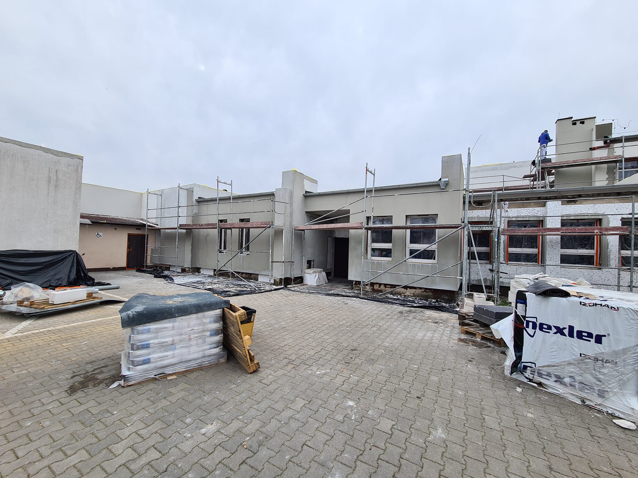 Prace związane z termomodernizacją budynku Przedszkola im. Marii Konopnickiej przy ul. Akacjowej 1 przebiegają zgodnie z planem. Dobiegają końca roboty dekarskie związane z dociepleniem dachu oraz postępują prace polegające na dociepleniu ścian budynku.