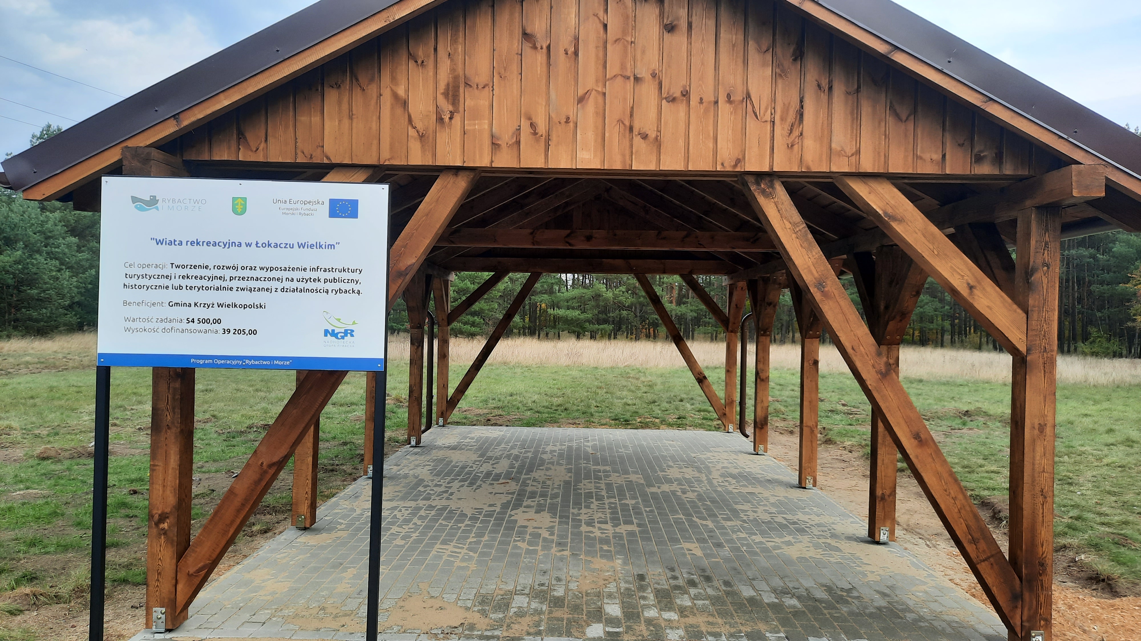 Gmina Krzyż Wielkopolski otrzymała dofinansowanie z Unii Europejskiej w ramach Programu Operacyjnego „Rybactwo i morze” 2014-2020 na realizację zadania pt.: „Wiata Rekreacyjna w Łokaczu Wielkim” w ramach działania „Realizacja lokalnych strategii rozwoju kierowanych przez społeczność” objętego Priorytetem 4. Zwiększenie zatrudnienia i spójności terytorialnej, zawartym w Programie, w tym związane z realizacją operacji własnych LGD, o których mowa w art. 17 ust. 3 pkt 2 ustawy o rozwoju lokalnym, w ramach celu Propagowanie dobrostanu społecznego i dziedzictwa kulturowego na obszarach rybackich i obszarach akwakultury, w tym dziedzictwa kulturowego, rybołówstwa i akwakultury oraz morskiego dziedzictwa kulturowego obejmującej Tworzenie, rozwój oraz wyposażenie infrastruktury turystycznej i rekreacyjnej, przeznaczonej na użytek publiczny, historycznie lub terytorialnie związanej z działalnością rybacką. W wyniku realizacji operacji zostanie osiągnięty następujący cel: Projekt zakłada utworzenie infrastruktury turystycznej poprzez postawienie wiaty w Łokaczu Wielkim. Wiata rekreacyjna będzie miejscem przeznaczonym dla mieszkańców Gminy Krzyż Wielkopolski i przybyłych turystów. Służyć będzie jako miejsce, gdzie rodziny i licznie przybywający kajakarze, rowerzyści spędzą przyjemnie czas w cieniu wiaty. Zwiększy się atrakcyjność obszaru Gminy Krzyż Wielkopolski i jednocześnie obszaru NGR.