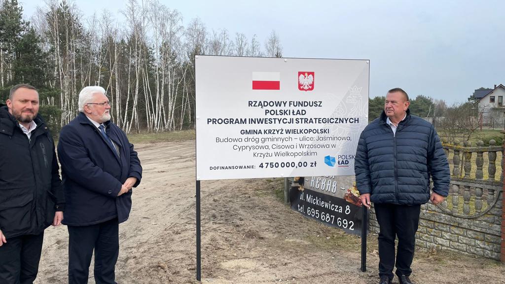 Kolejnym punktem wizyty była inwestycja pn. "Budowa dróg gminnych - ulice Jaśminowa, Cyprysowa, Cisowa i Wrzosowa w Krzyżu Wielkopolskim", gdzie zakończone zostały prace branży sanitarnej, a rozpoczęły się roboty branży drogowej. Zadanie to jest dofinansowane z Programu Rządowego Fundusz Polski Ład: Program Inwestycji Strategicznych w wysokości 4 750 000,00 zł.
