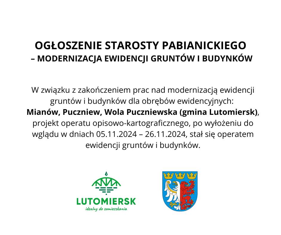 Informujemy, że w związku z zakończeniem prac nad modernizacją ewidencji gruntów i budynków dla obrębów ewidencyjnych: Mianów, Puczniew, Wola Puczniewska (gmina Lutomiersk), projekt operatu opisowo-kartograficznego, po wyłożeniu do wglądu w dniach 05.11.2024 – 26.11.2024, stał się operatem ewidencji gruntów i budynków.