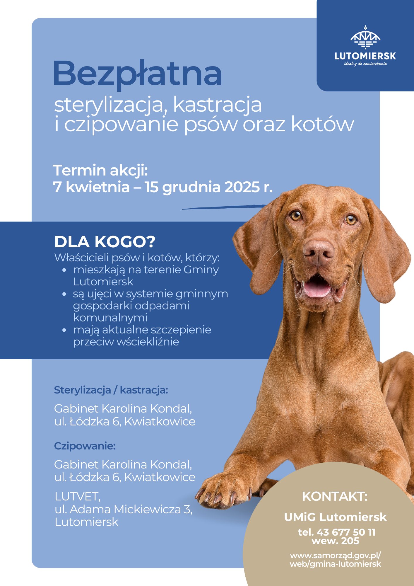 📢 W ramach Programu opieki nad zwierzętami bezdomnymi oraz zapobiegania ich bezdomności w 2025 roku ogłaszamy bezpłatną akcję sterylizacji, kastracji i czipowania psów oraz kotów.
