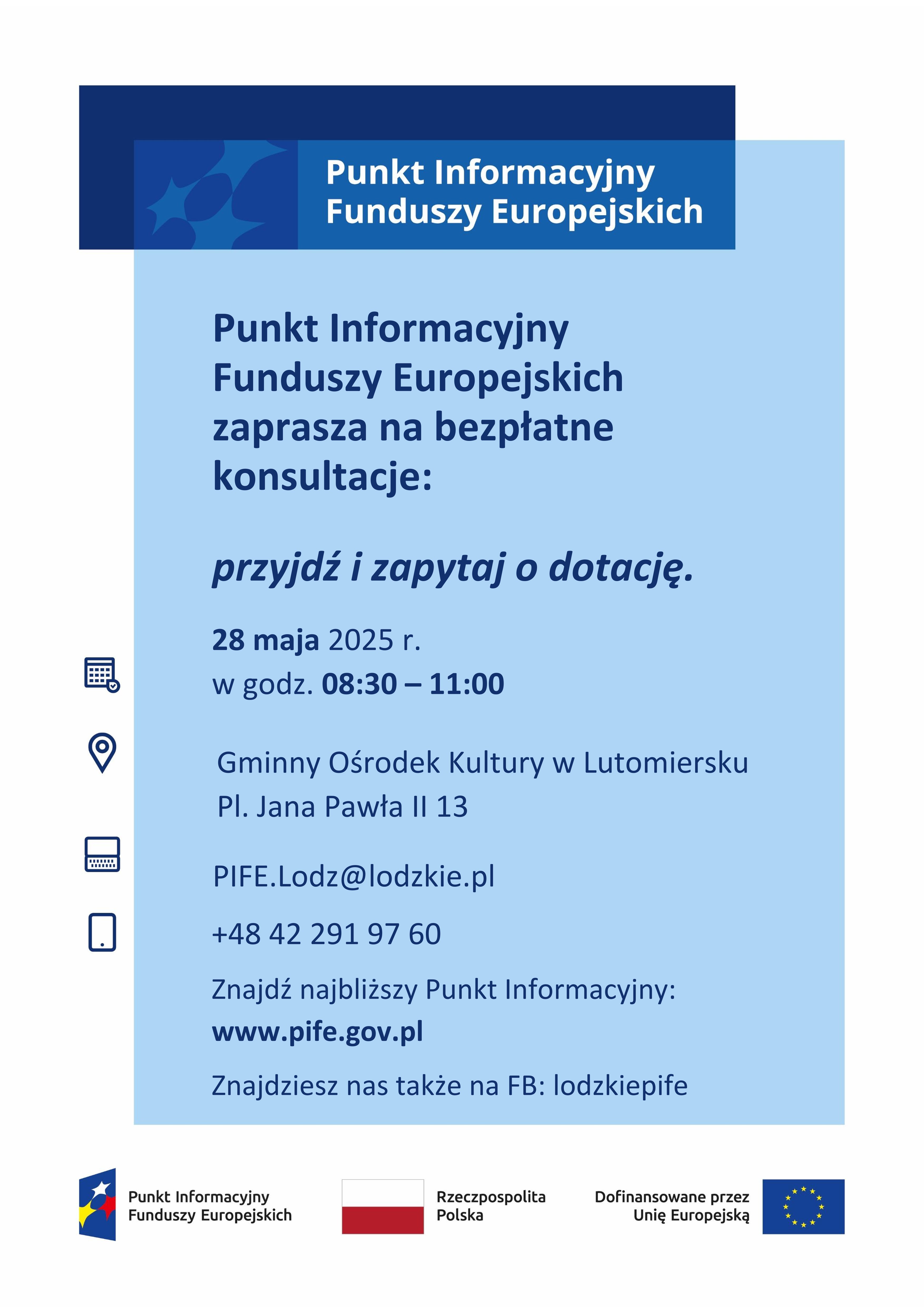 Punkt Informacyjny Funduszy Europejskich zaprasza na bezpłatne konsultacje dotyczące dotacji. Spotkanie odbędzie się 28 maja 2025 r. w godzinach 08:30 – 11:00 w Gminnym Ośrodku Kultury w Lutomiersku