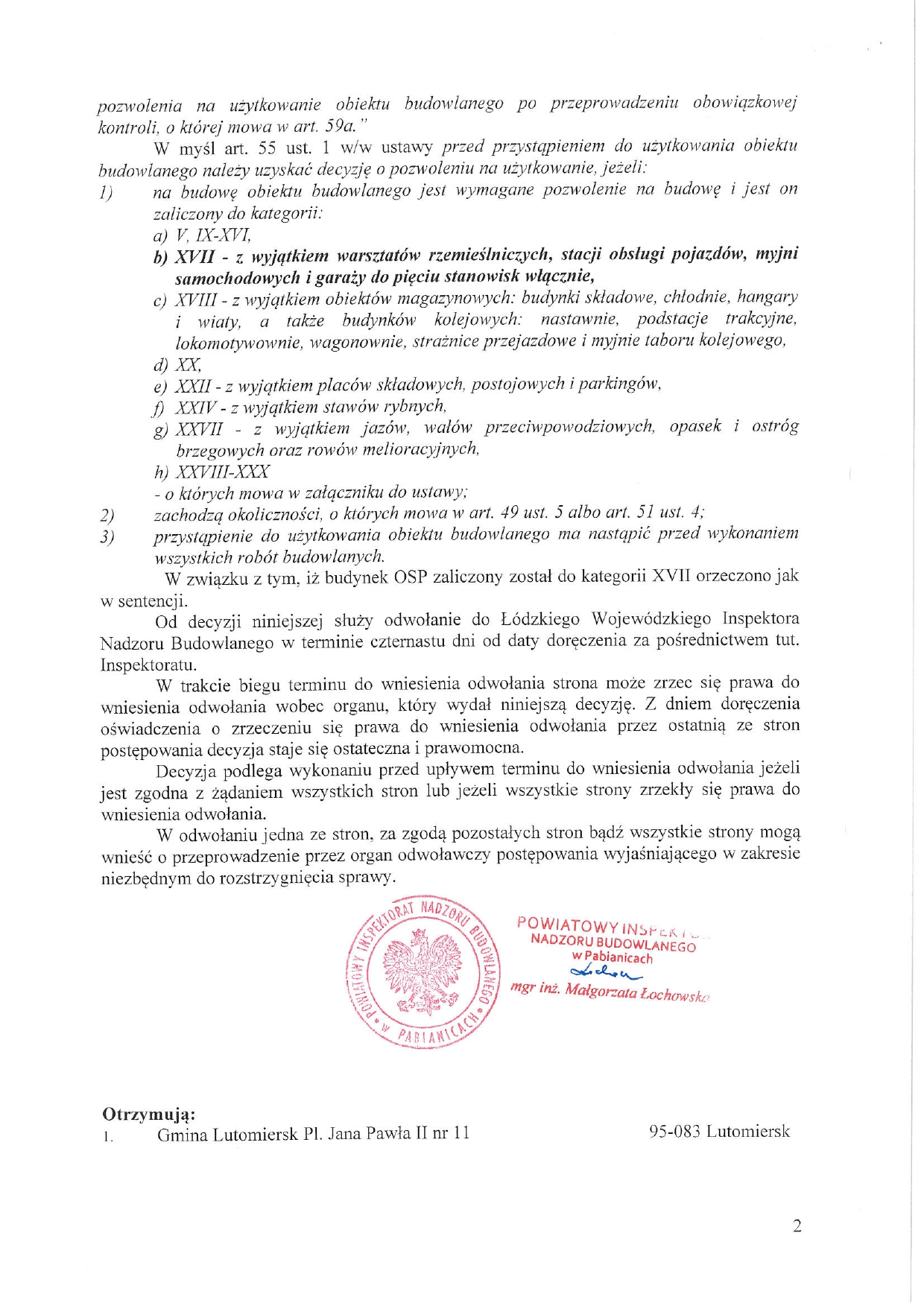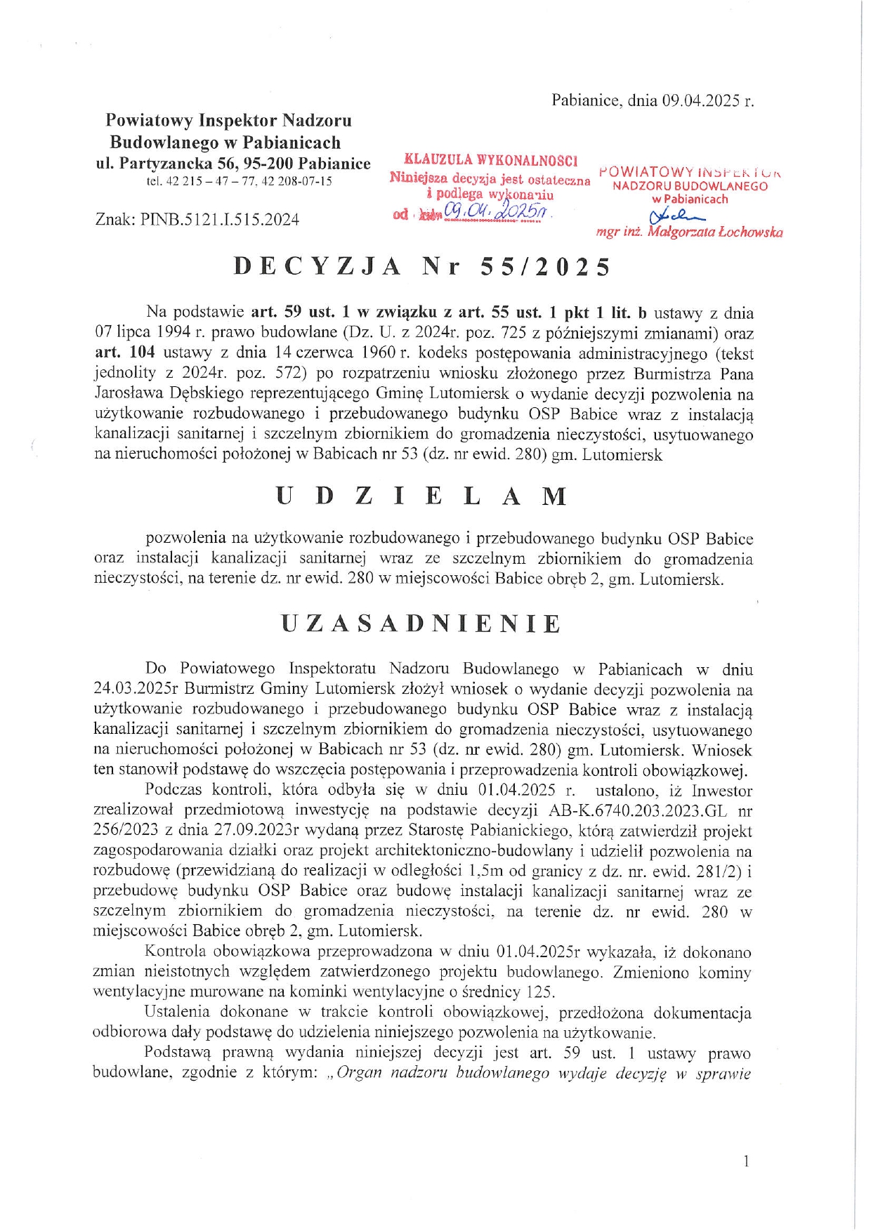 Z radością informujemy, że Gmina Lutomiersk otrzymała pozytywną decyzję Powiatowego Inspektora Nadzoru Budowlanego w Pabianicach w sprawie dopuszczenia do użytkowania rozbudowanego i przebudowanego budynku OSP Babice, wraz z nową instalacją kanalizacji sanitarnej i szczelnym zbiornikiem na nieczystości.