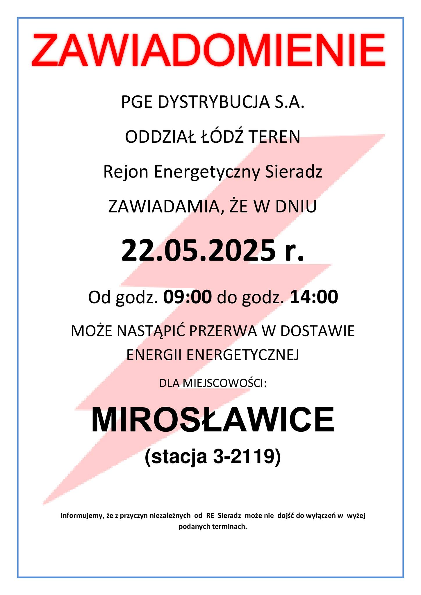 Może nastąpić przerwa w dostawie energii elektrycznej 📅 Data: 22 maja 2025 r. 🕘 Godzina: 09:00 – 14:00 📍 Miejsce: Mirosławice (stacja 3-2119)