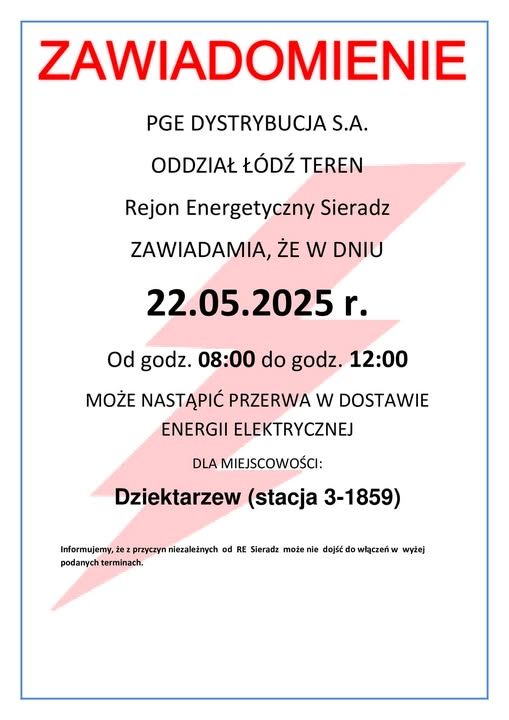 Może nastąpić przerwa w dostawie energii elektrycznej 📅 Data: 22 maja 2025 r. 🕘 Godzina: 08:00 – 12:00 📍 Miejsce: Dziektarzew (stacja 3-1859)