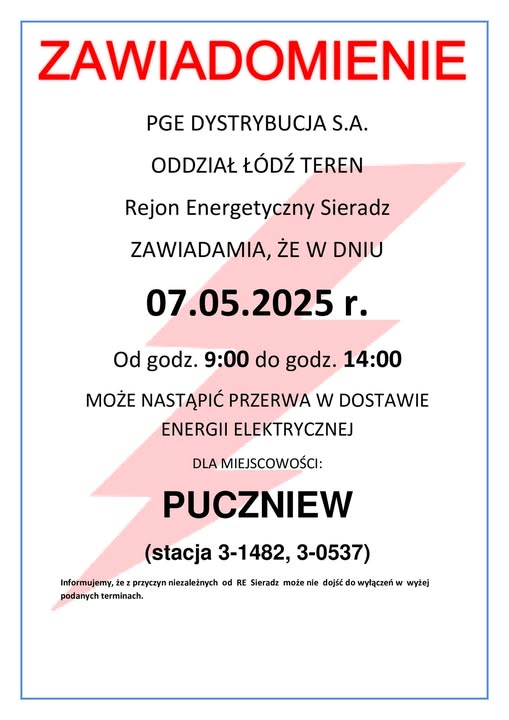 PGE Dystrybucja S.A., Oddział Łódź Teren, Rejon Energetyczny Sieradz informuje, że w dniu 7 maja 2025 r. w godzinach od 9:00 do 14:00 może nastąpić przerwa w dostawie energii elektrycznej dla miejscowości Puczniew (stacje 3-1482, 3-0537).